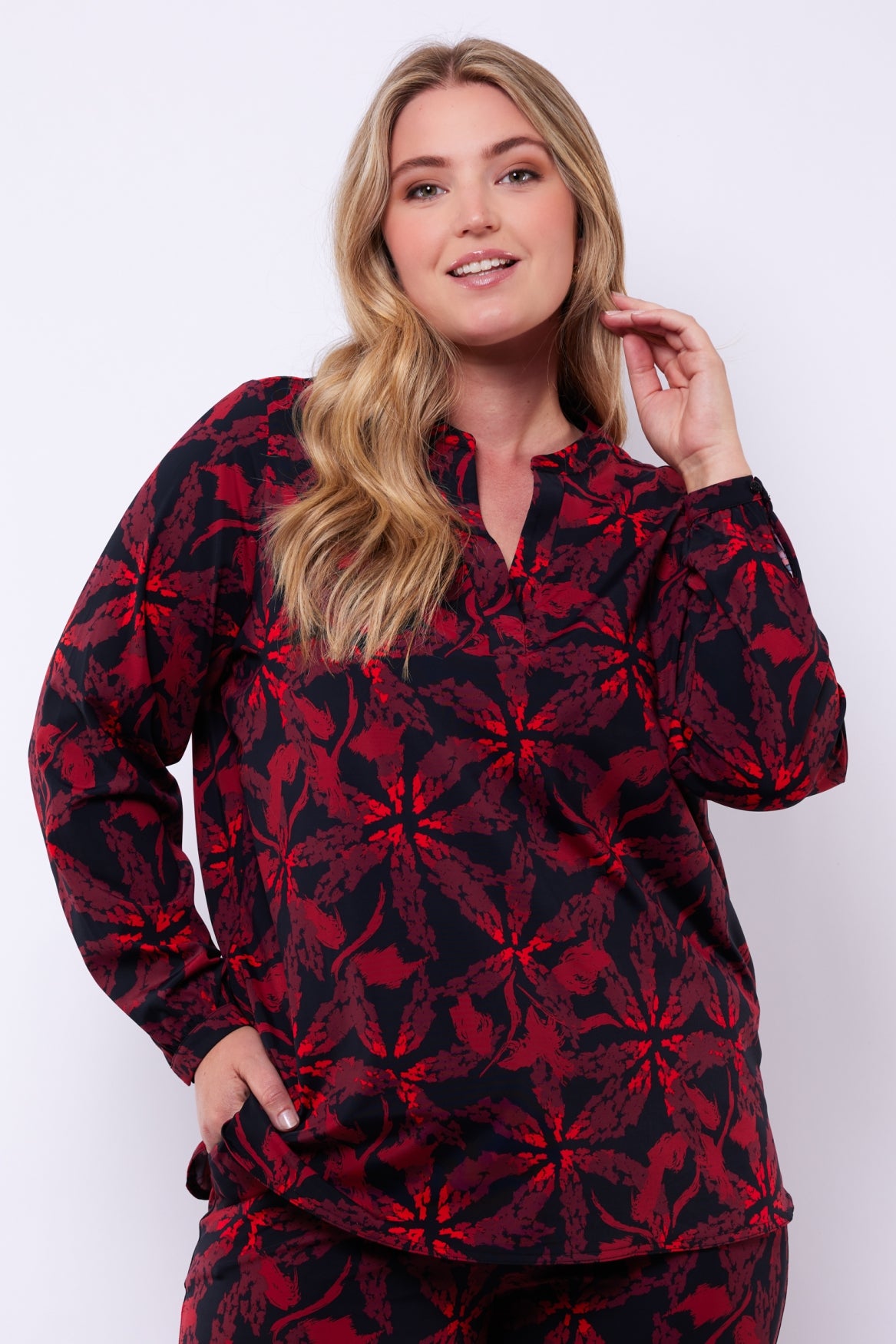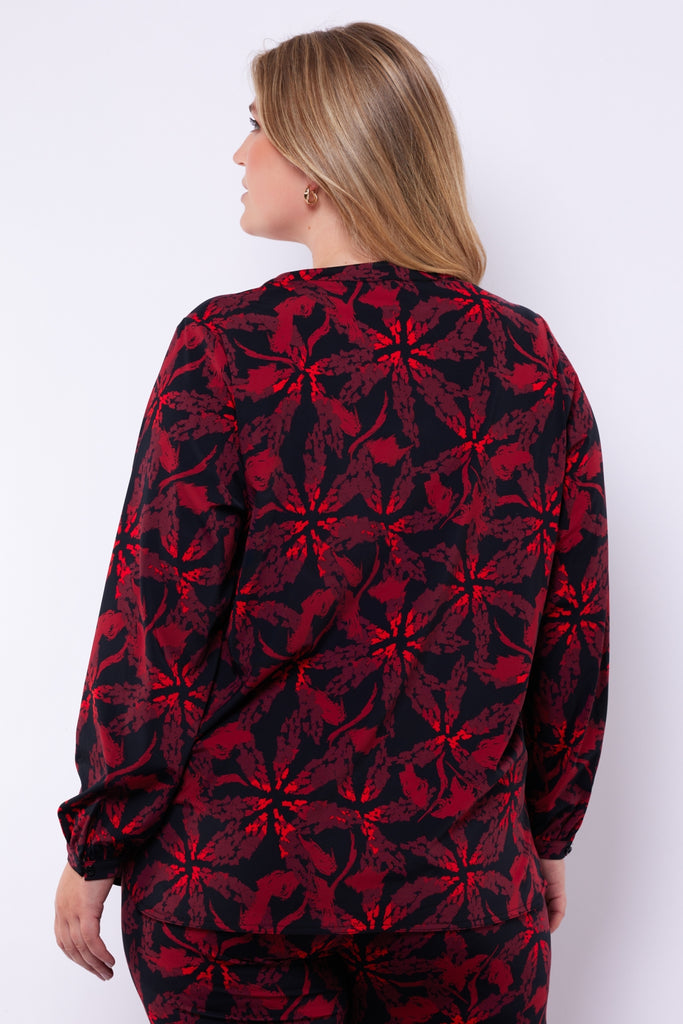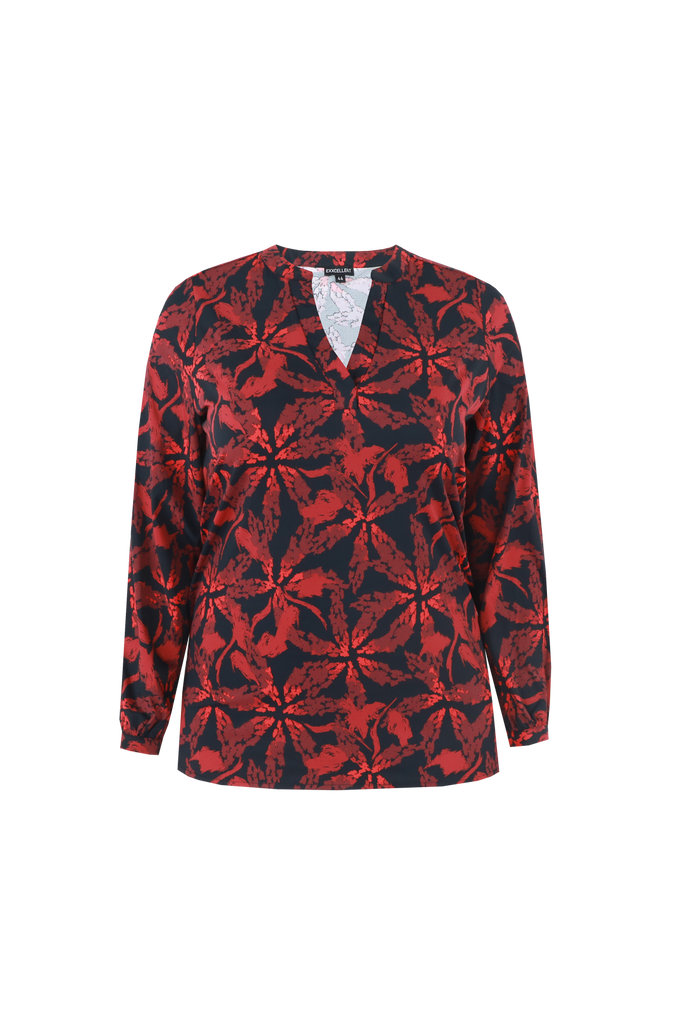 De Casey top valt op door zijn unieke grafische print die direct een moderne en krachtige uitstraling geeft. Het luchtige materiaal en de rechte pasvorm zorgen voor ultiem draagcomfort, terwijl de V-hals en lange mouwen het item een vrouwelijke touch geven. Perfect om jouw look nét dat beetje extra te geven, of je hem nu combineert met een broek of rok.
