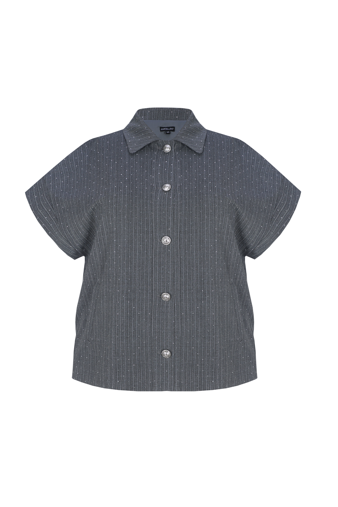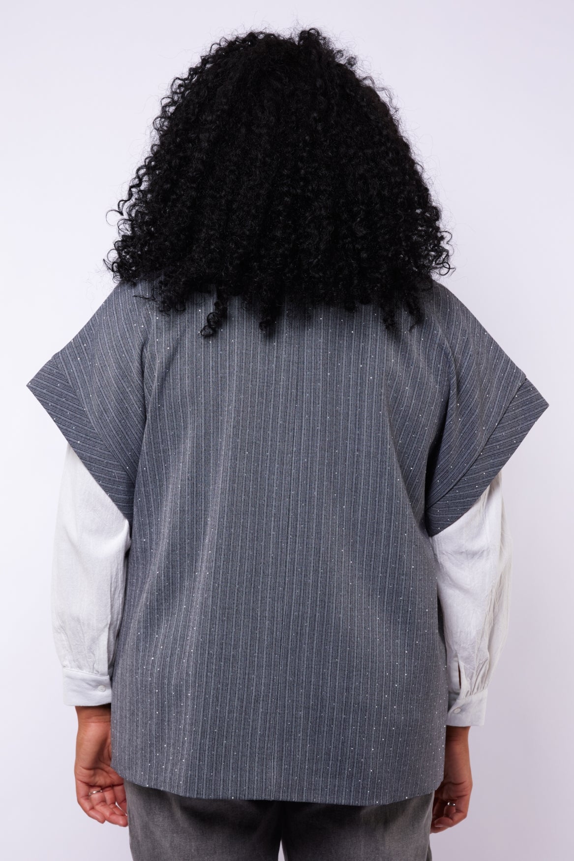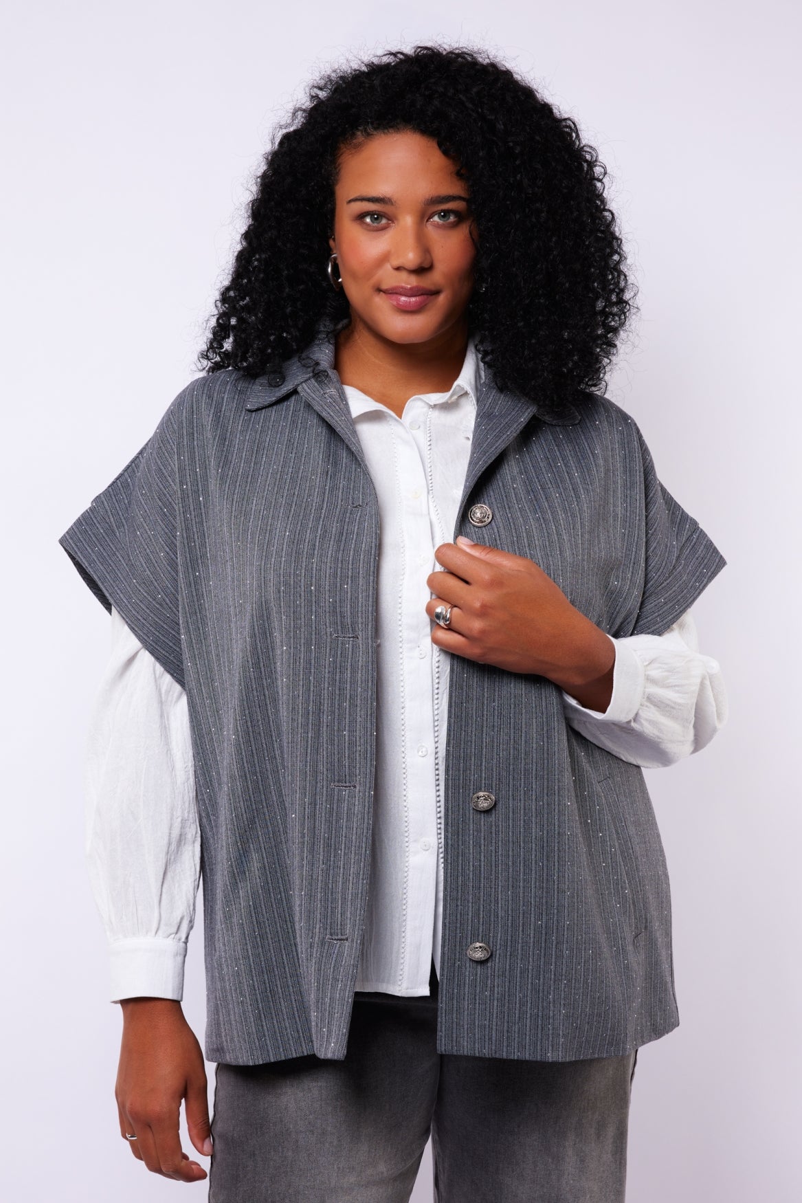 Een vleugje sprankeling voor elke dag. De Della gilet is uitgevoerd in een fijne structuurstof met subtiele glitters en verticale strepen die het silhouet verlengen. De korte mouwen en grote knopen geven een moderne, casual uitstraling, ideaal om te dragen over een blouse of coltrui.