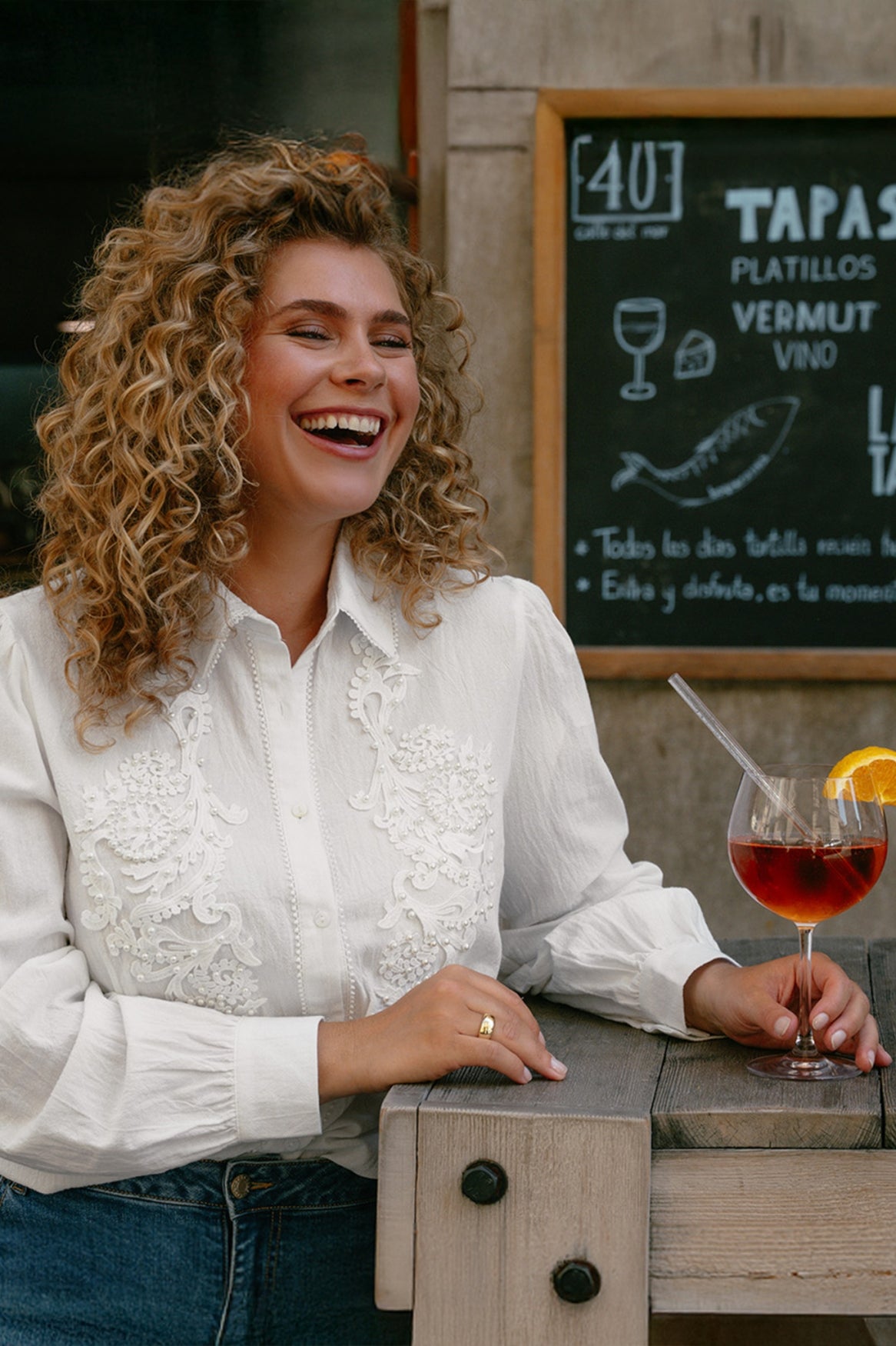 Het model is 179 cm lang en draagt een maat 46.
