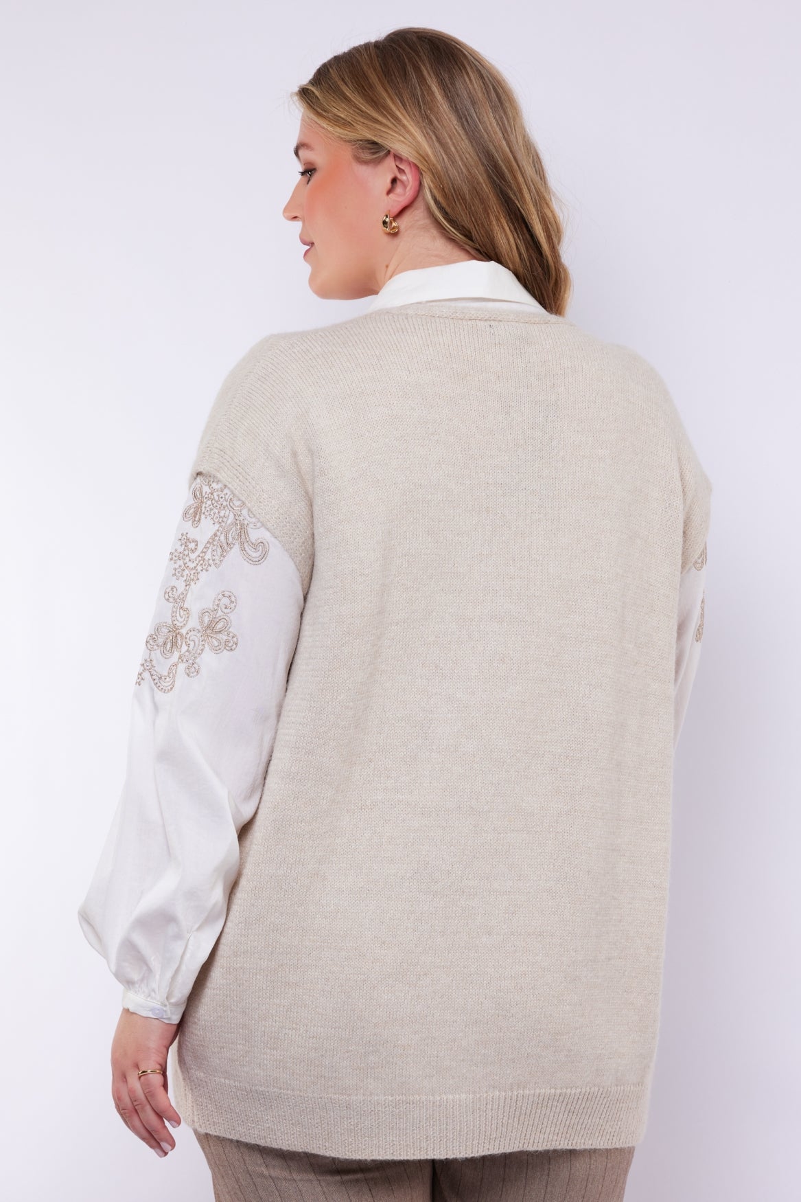 Het model is 178 cm lang en draagt een maat 46.