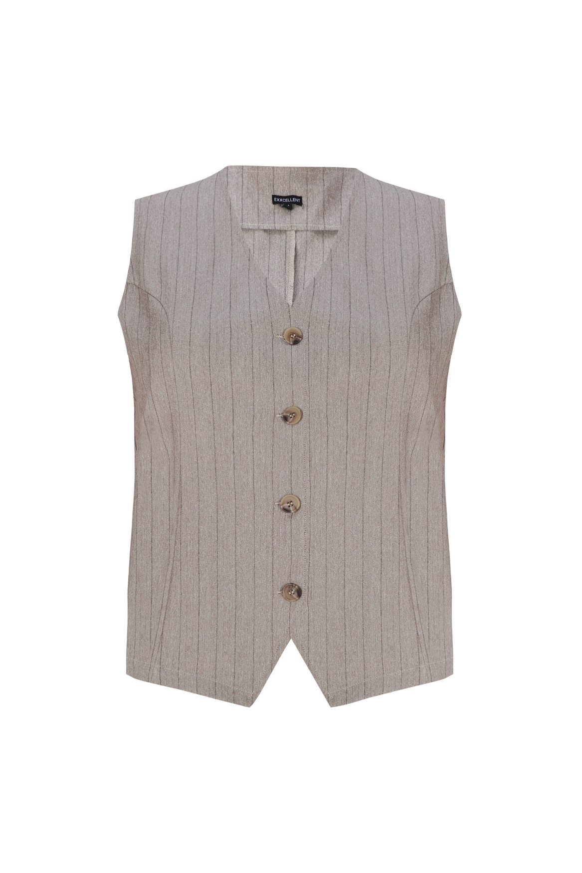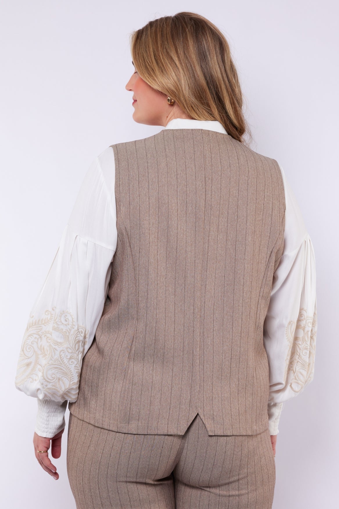 Een stijlvolle toevoeging aan je garderobe. De Vera gilet combineert een tijdloze look met moderne elegantie. Het subtiele streepdessin en de getailleerde snit zorgen voor een vrouwelijke uitstraling, terwijl de knoopsluiting aan de voorzijde het geheel klassiek houdt. Perfect te combineren met de Yfke broek voor een ton-sur-ton look.