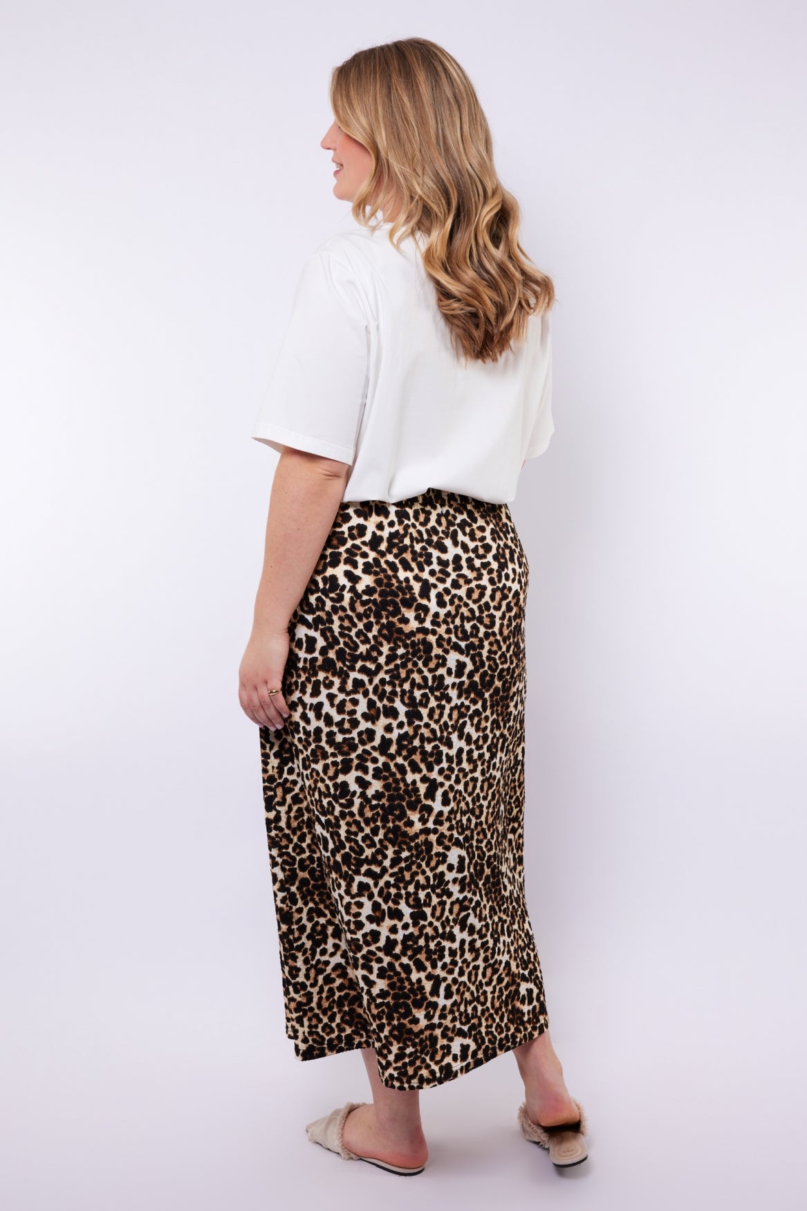 Een uitgesproken eyecatcher met een krachtige en vrouwelijke uitstraling. De Lennon rok heeft een soepelvallende, licht uitlopende pasvorm met een comfortabele elastische tailleband die mooi aansluit en prettig draagt. De tijdloze panterprint en de subtiele structuur in de stof geven het ontwerp een modieuze en speelse touch.