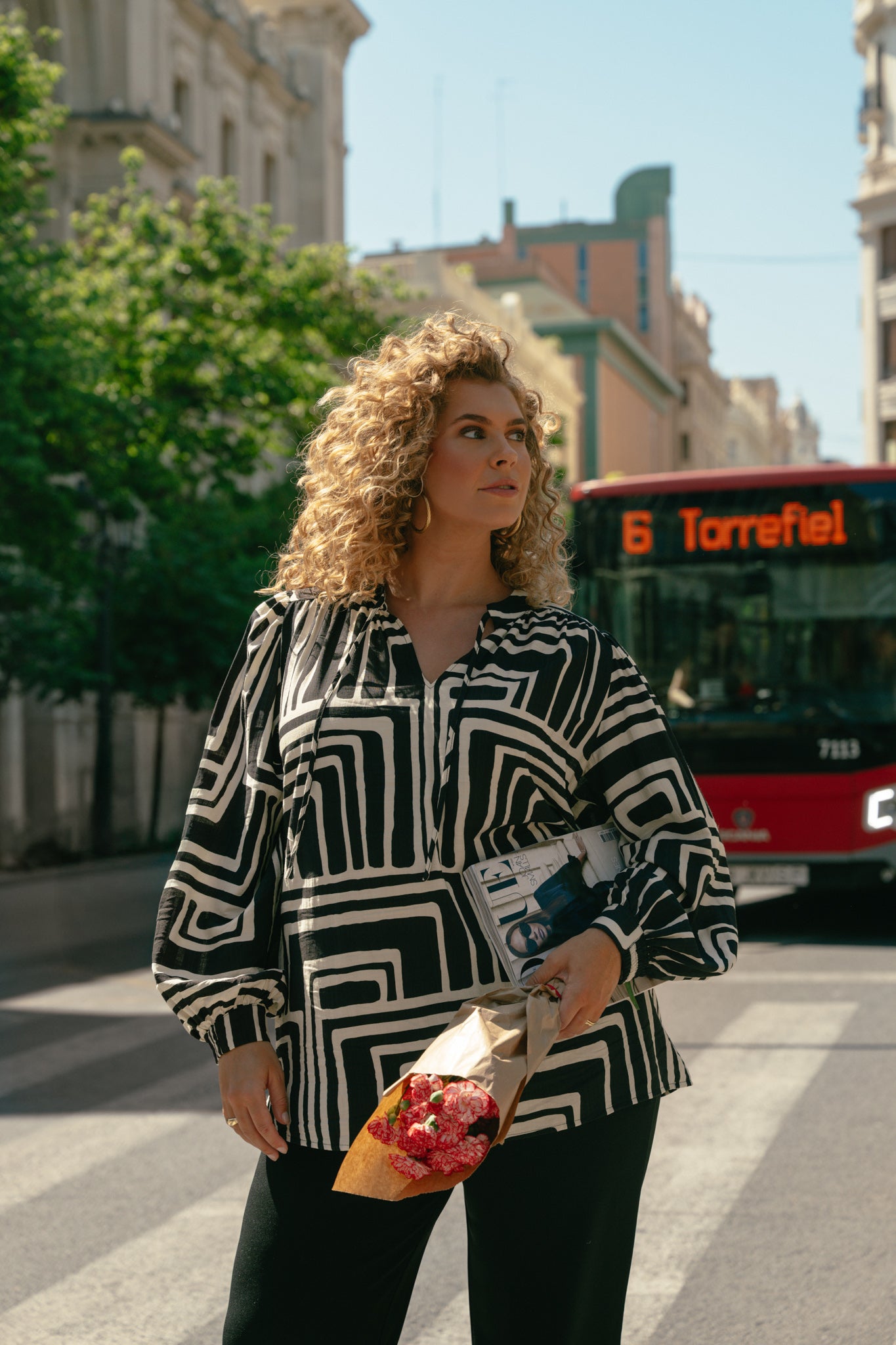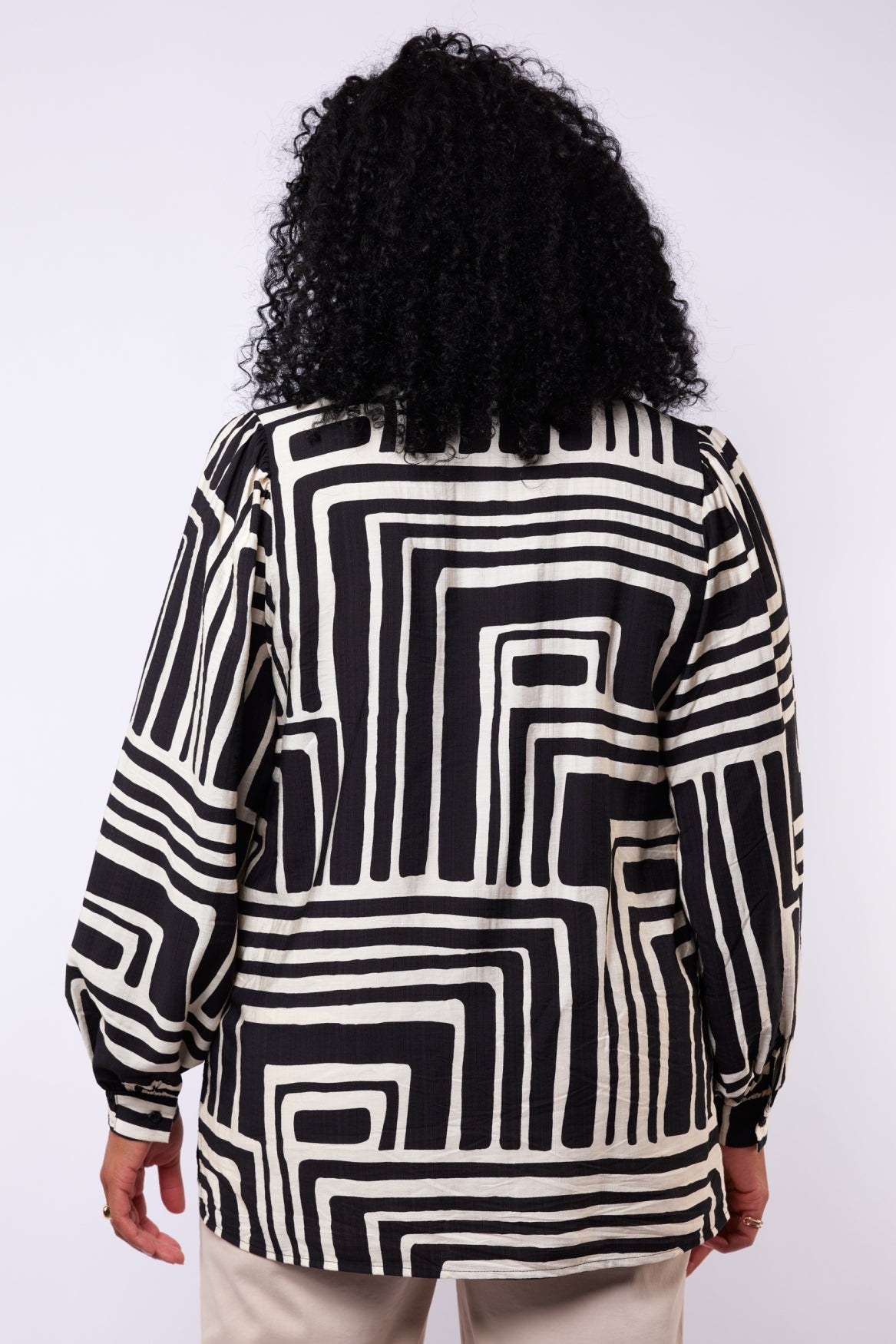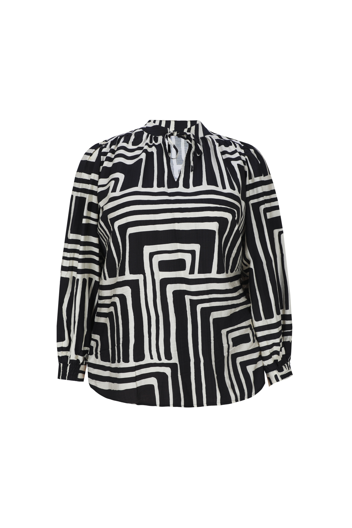 De Lumina top heeft een opvallende grafische print in zwart-wit en een subtiel strikdetail bij de hals. Dankzij de luchtige stof en lange mouwen combineert deze top moeiteloos comfort met een elegante uitstraling. Een eigentijds statement voor elke gelegenheid. Voor dit artikel adviseren we een koud handwas.