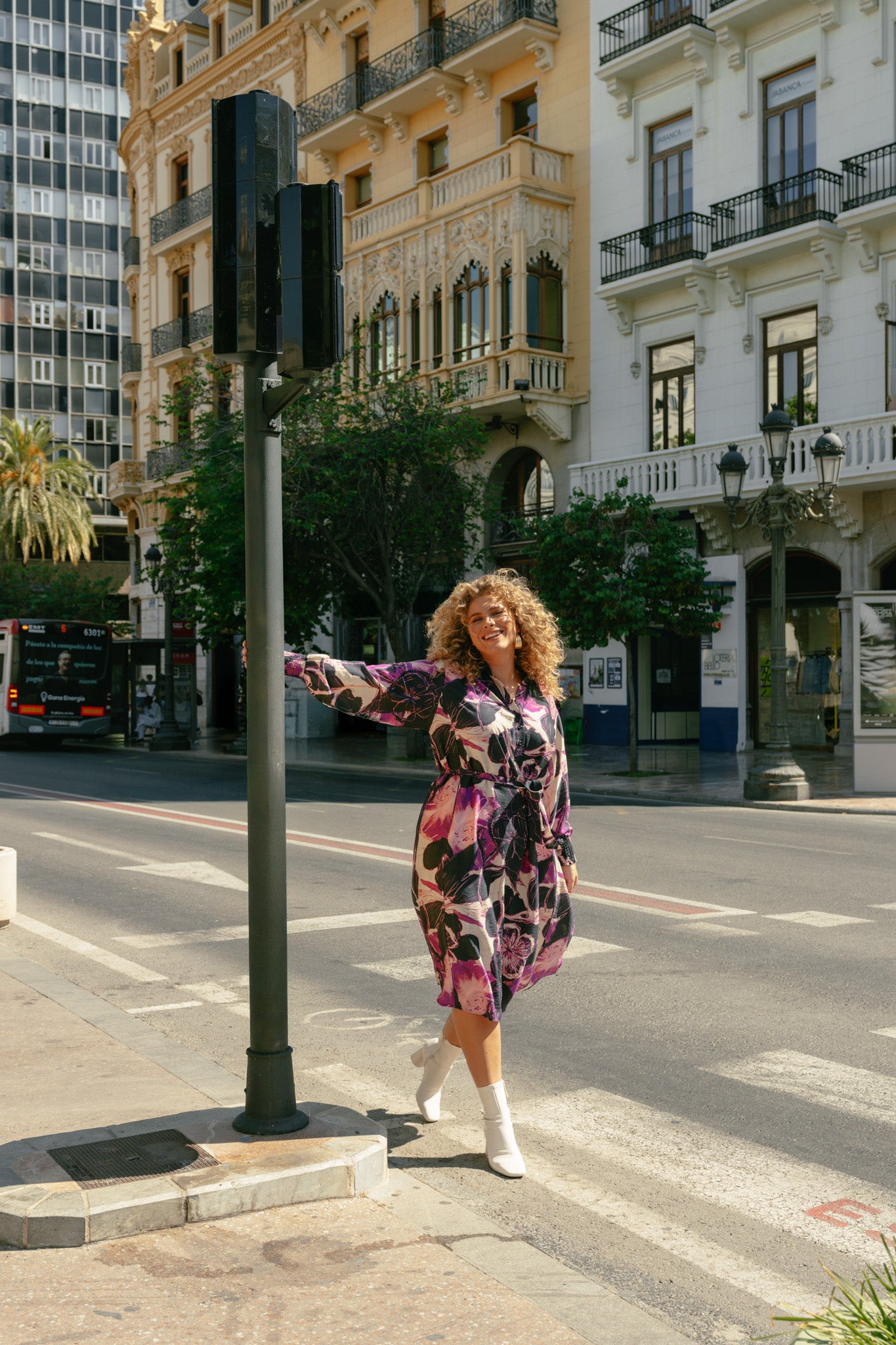 Het model is 179 cm lang en draagt een maat 46.