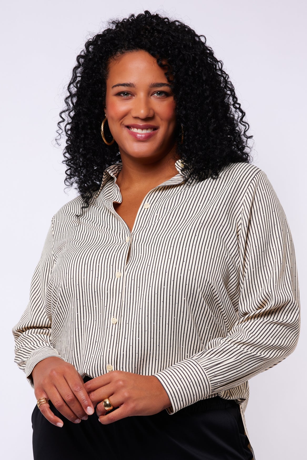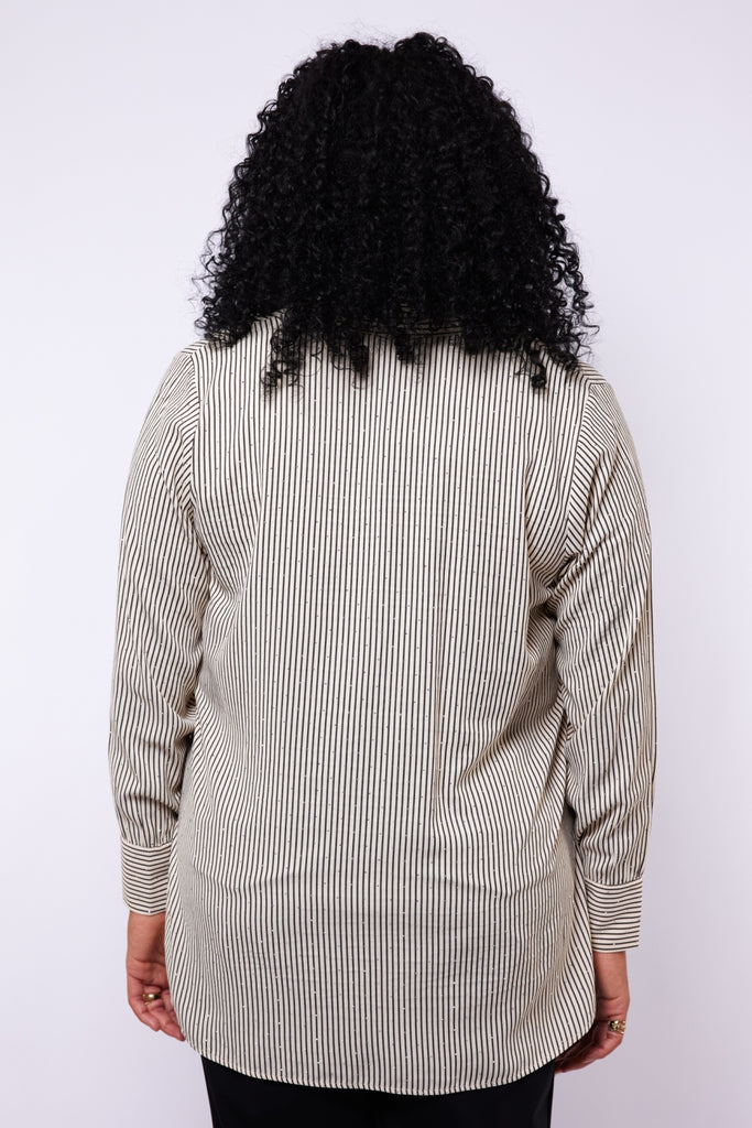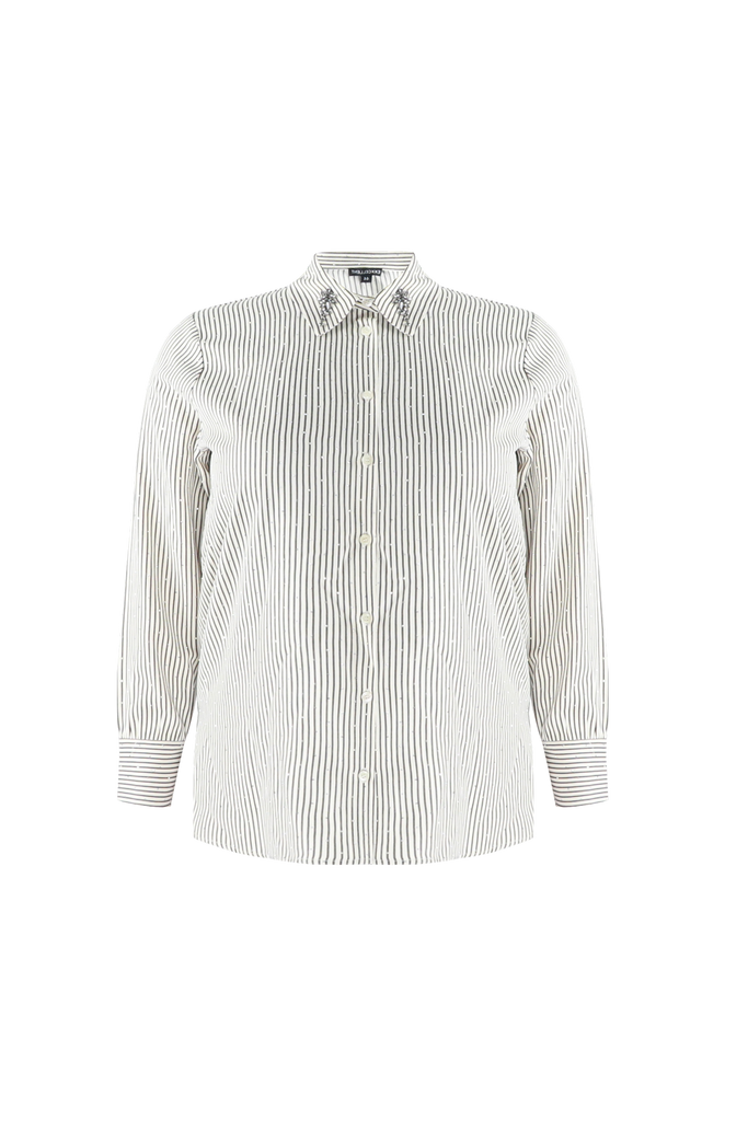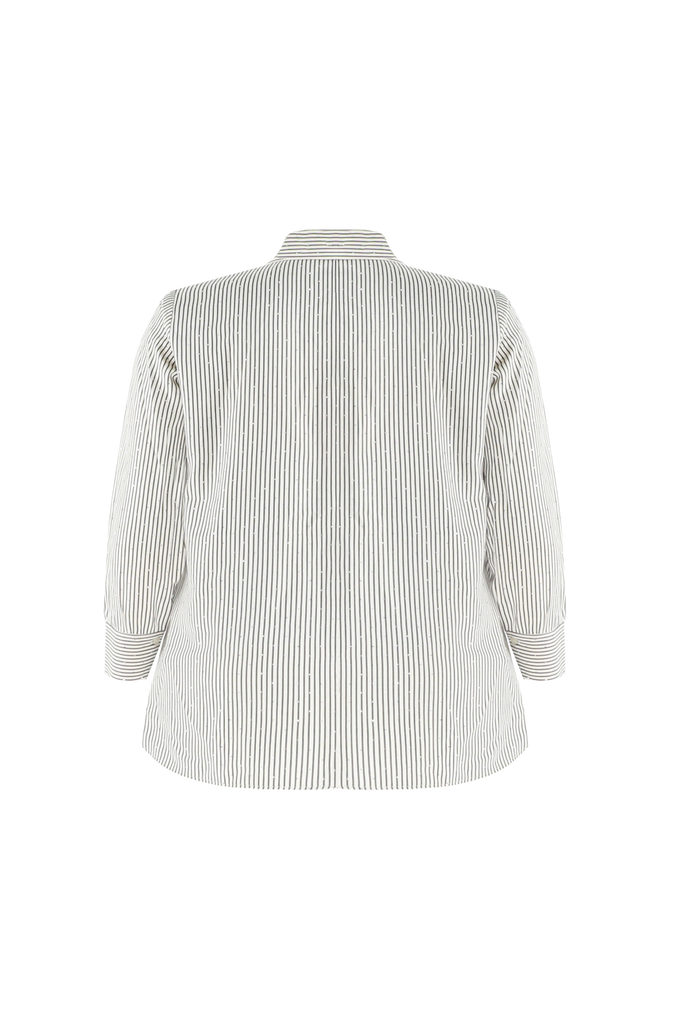 De Lyra blouse combineert elegantie met een vleugje speelsheid. De verfijnde streepstructuur krijgt extra karakter door de sierlijke details aan de kraag. De lange mouwen met klassieke manchetten geven het geheel een stijlvolle afwerking.