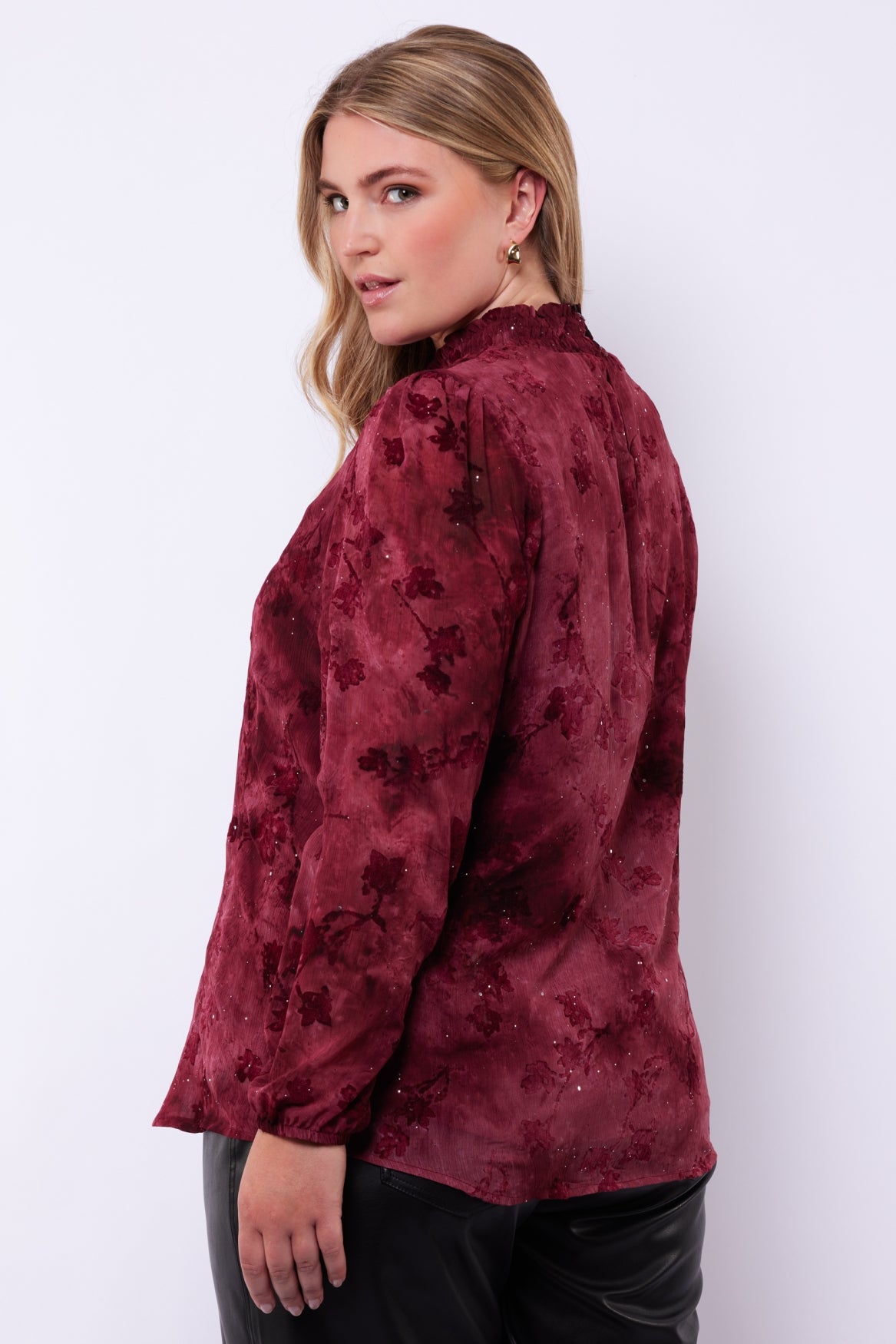 De Zia top straalt elegantie uit door haar rijke rode kleurschakeringen en subtiele glans. De hoge hals met geplooide afwerking geeft het geheel een vrouwelijke en modieuze uitstraling. Dankzij de luchtige stof en tijdloze pasvorm is deze top een stijlvol item dat zowel overdag als ’s avonds perfect tot zijn recht komt. Een verfijnde toevoeging aan je garderobe waarmee je moeiteloos een krachtige look creëert.