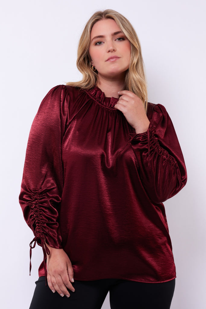 De Adele top is een echte blikvanger met een rijke uitstraling en verfijnde details. De glanzende stof en elegante ruches langs de opstaande hals zorgen voor een vrouwelijke en expressieve look. De mouwen zijn speels geplooid en afgewerkt met striklinten voor een subtiel statement. De soepele pasvorm voelt comfortabel aan en geeft je alle ruimte om te bewegen. Draag de Adele top met een elegante broek of een rok voor een stijlvolle combinatie met karakter. Een top die jouw persoonlijkheid moeiteloos onderstreept.