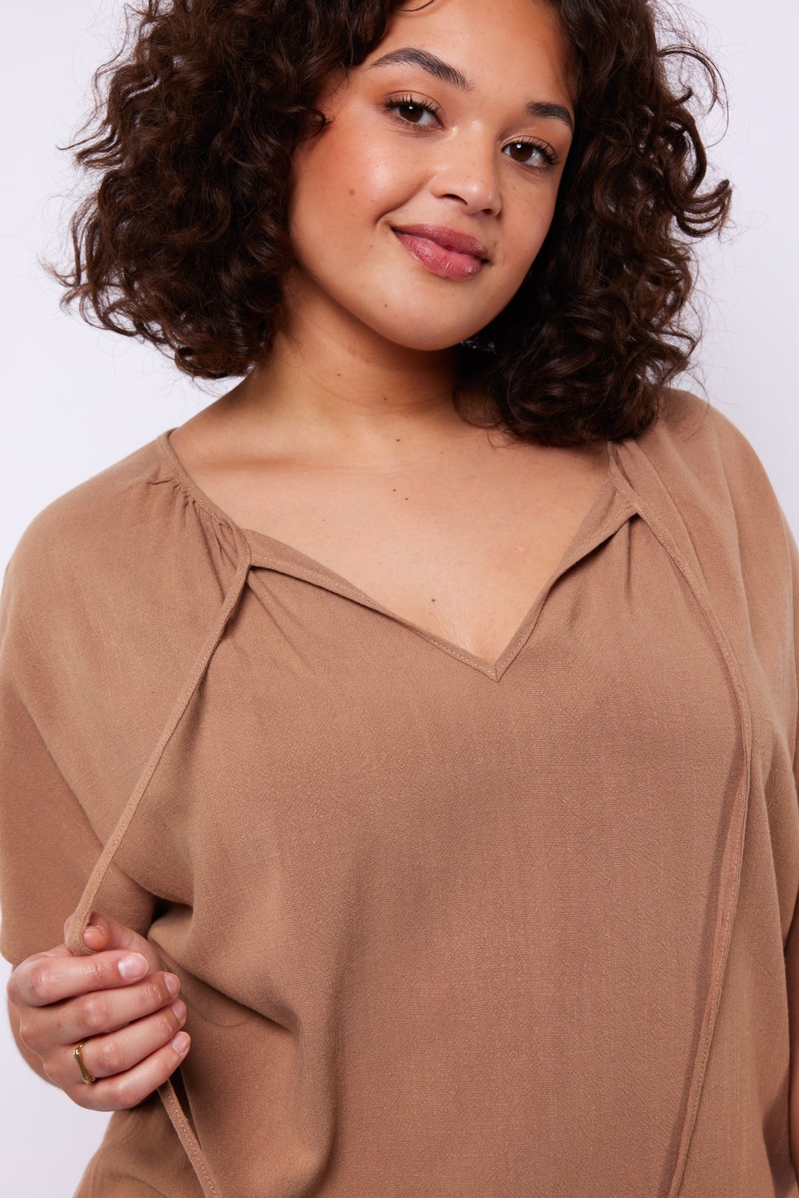 Een luchtige top met een vrouwelijke en relaxte uitstraling. De Abril top heeft een losvallende pasvorm met een subtiele V-hals en strikdetail, wat zorgt voor een speelse en zachte touch. De korte mouwen en soepelvallende stof maken het geheel comfortabel en makkelijk te dragen. De elastische zoom geeft de top een licht bloezend effect voor een flatterend silhouet.