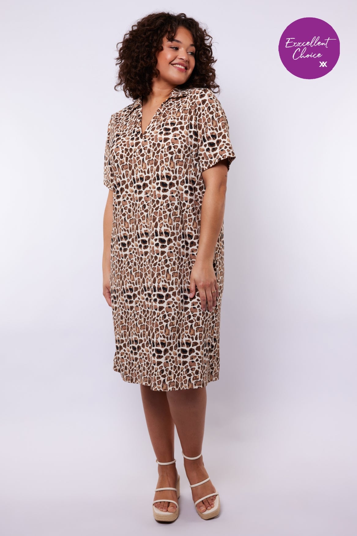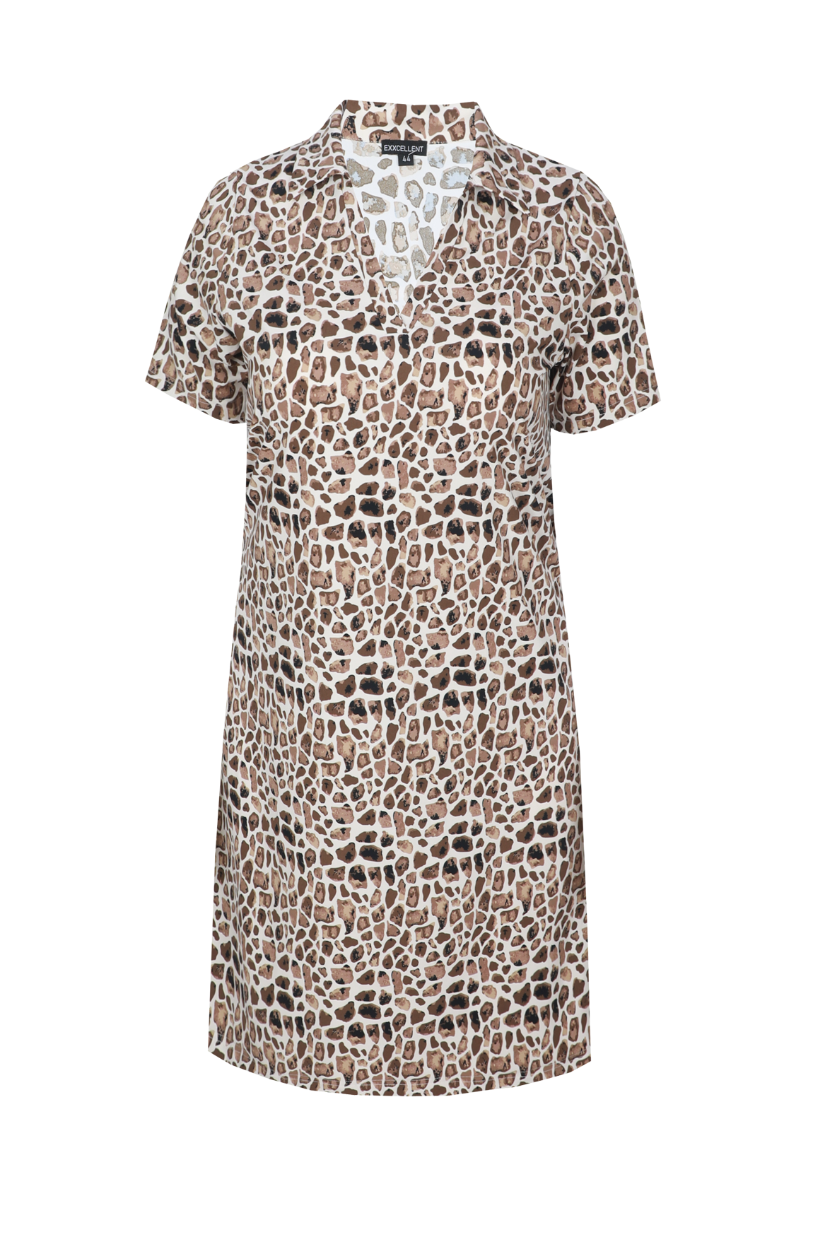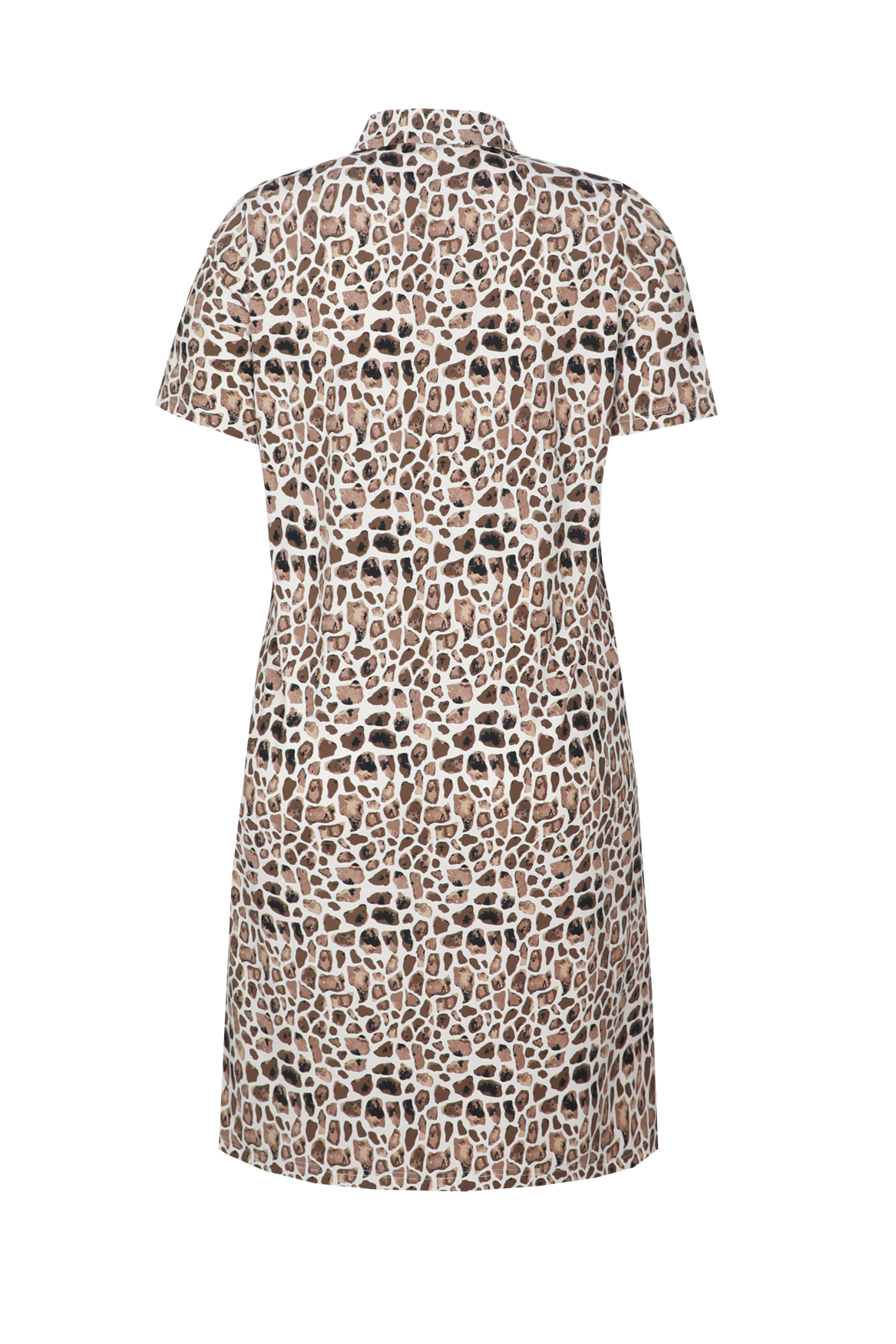Een stijlvolle jurk met een tijdloze panterprint en een comfortabele uitstraling. De Arya jurk heeft een losvallende pasvorm met een klassieke kraag en korte mouwen, wat zorgt voor een luchtig en vrouwelijk silhouet. Het rechte model valt soepel langs het lichaam en biedt een fijne draagervaring.