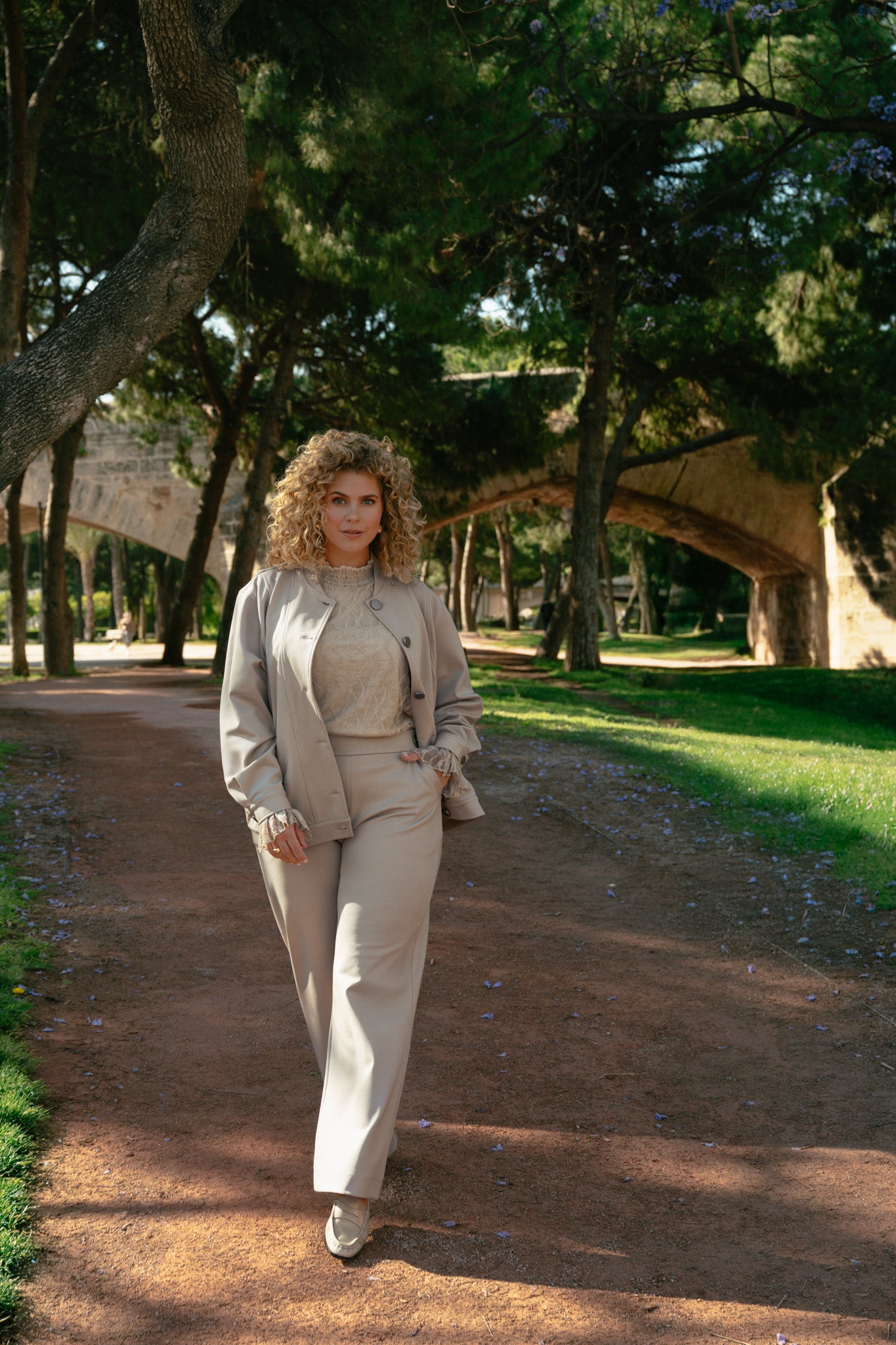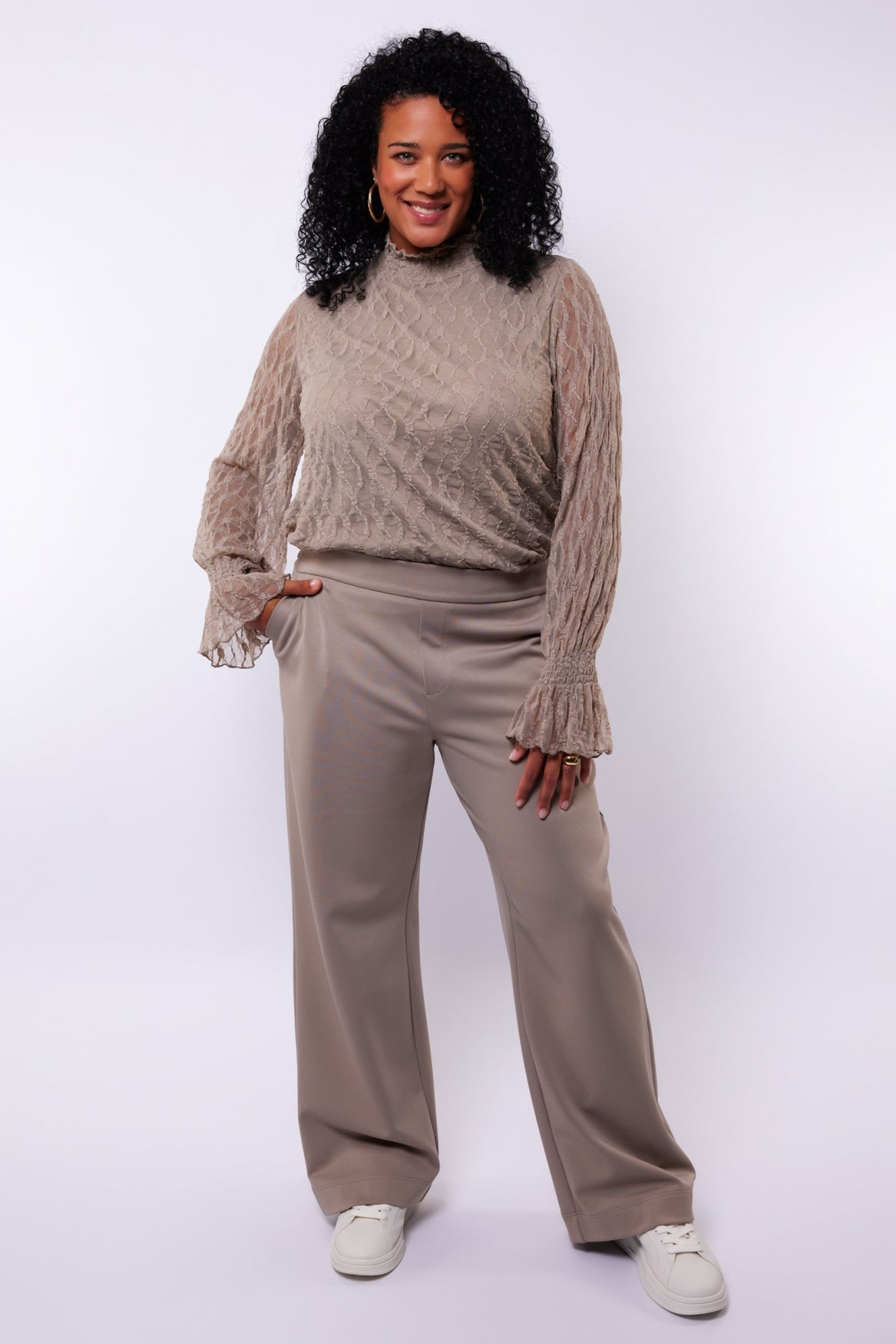 Comfort en stijl komen samen in de Bertine broek. Deze broek heeft een moderne, rechte pasvorm met een subtiele flair en een elastische tailleband aan de achterzijde voor extra draaggemak. Perfect te combineren met de Isolde jacket voor een stijlvolle co-ord look.