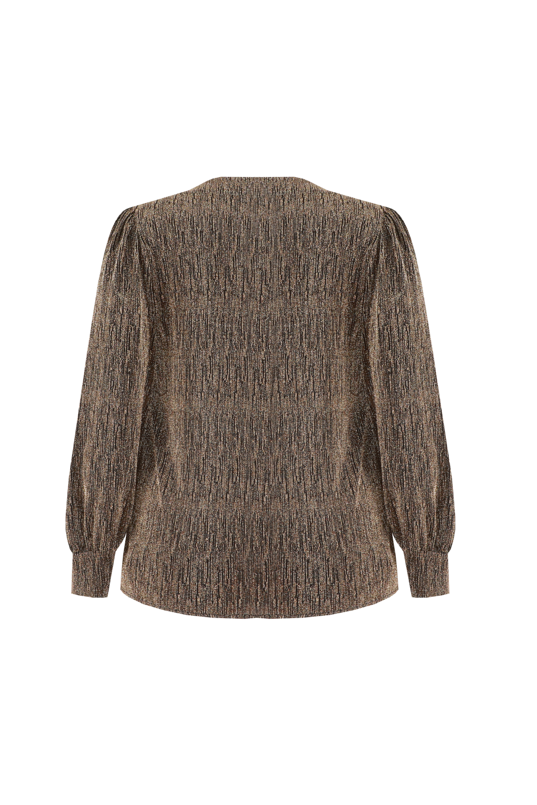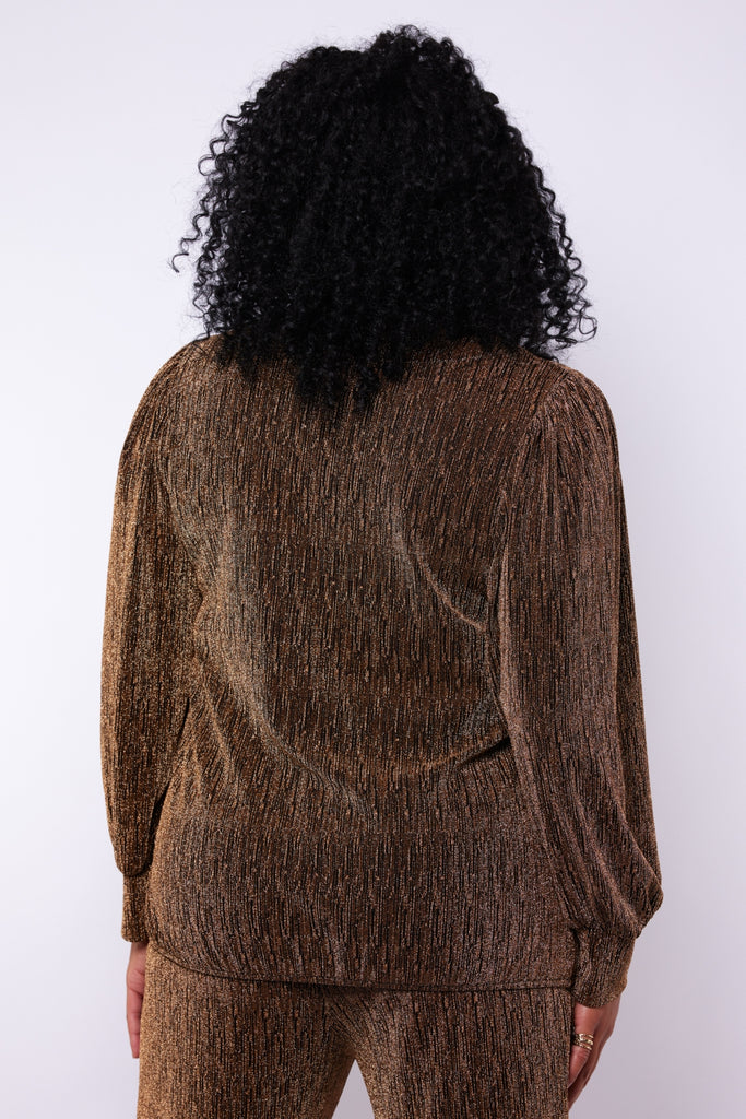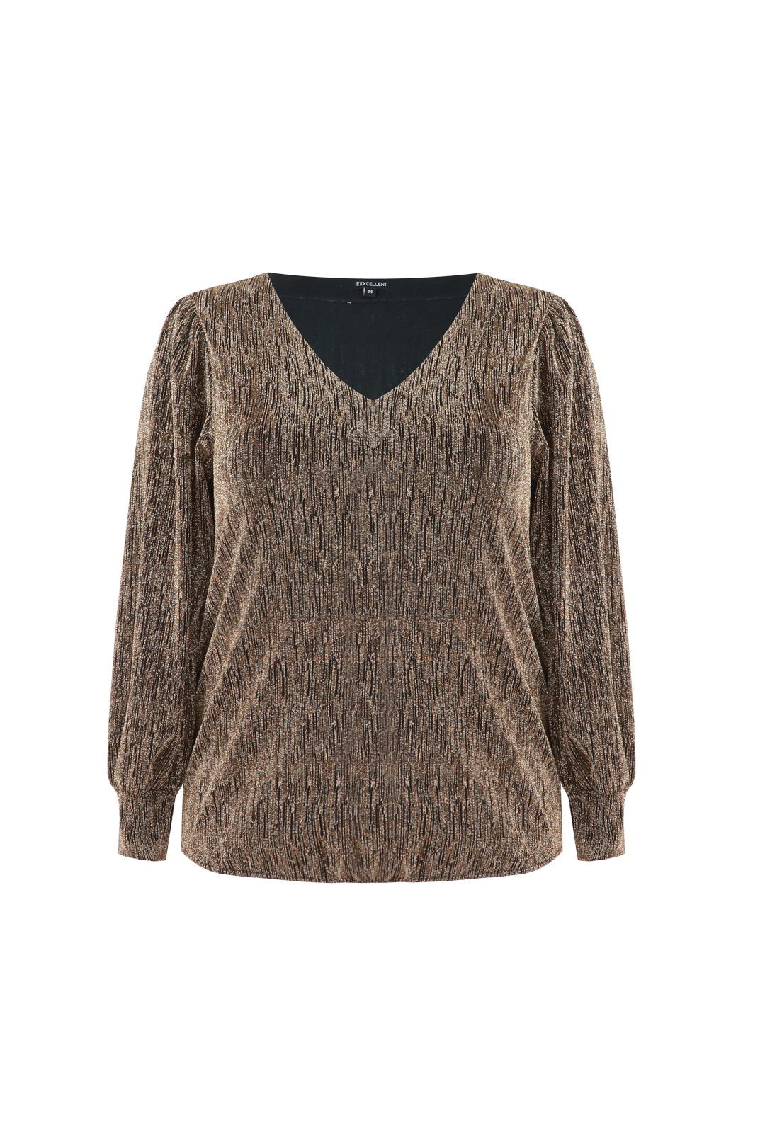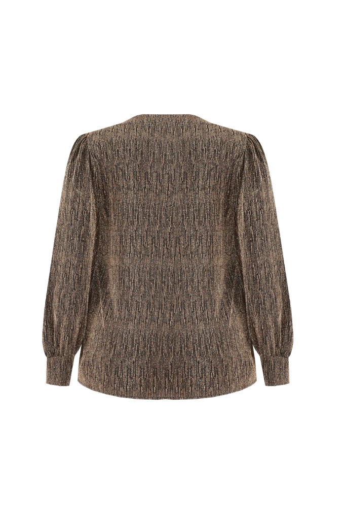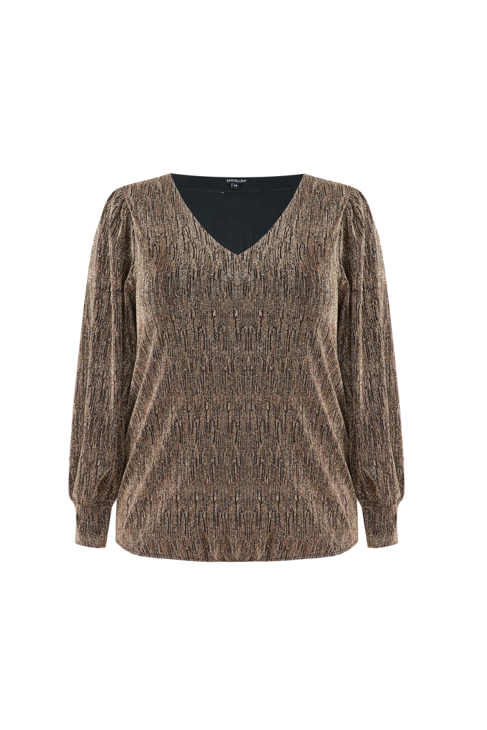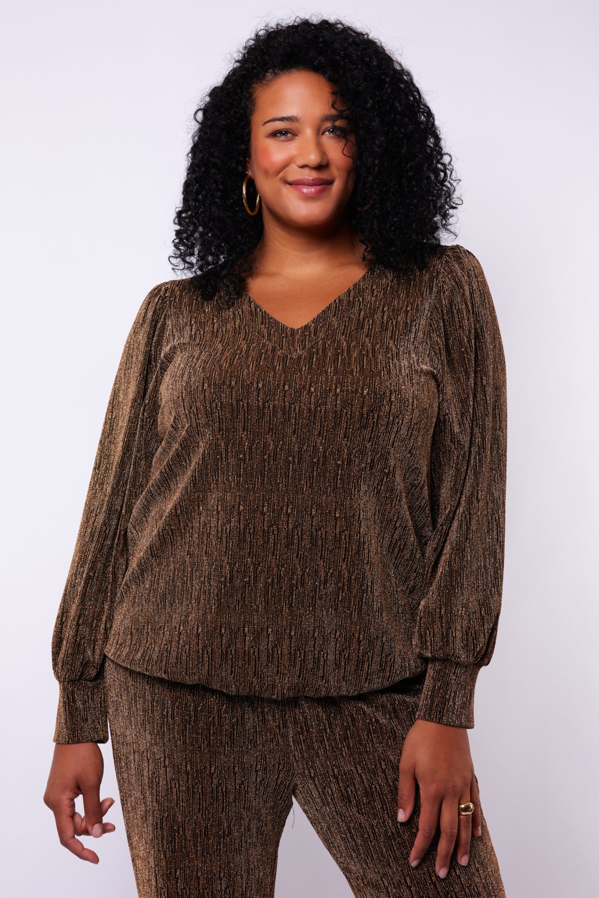 De Bes top straalt elegantie uit met een subtiele glans en verfijnde structuur. De diepe V-hals zorgt voor een vrouwelijke touch, terwijl de licht gepofte mouwen met brede manchetten een speelse twist geven. Dankzij het elastiek in de zoom krijgt de top een licht blousend effect. Ideaal om je outfit moeiteloos een feestelijke uitstraling te geven.
