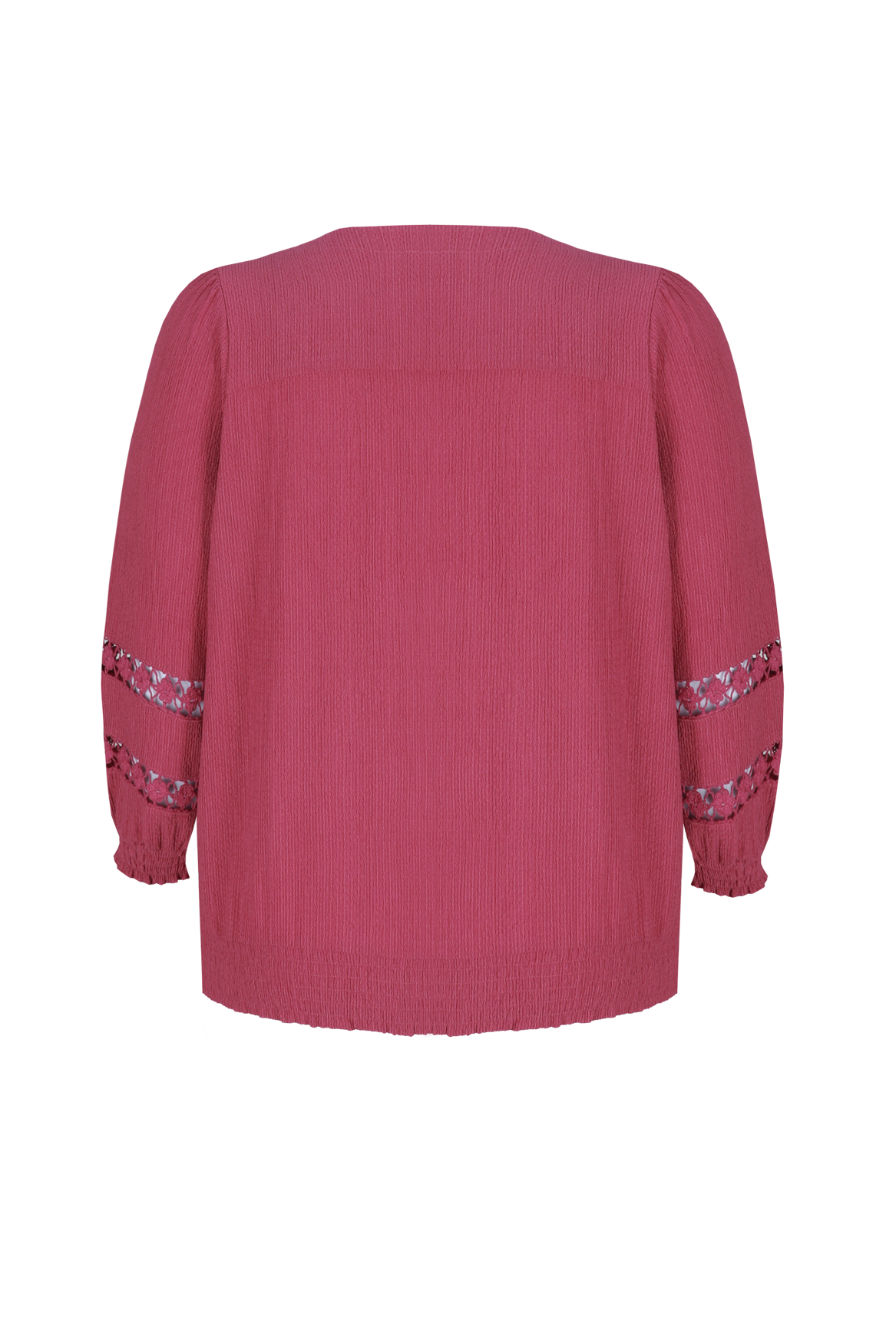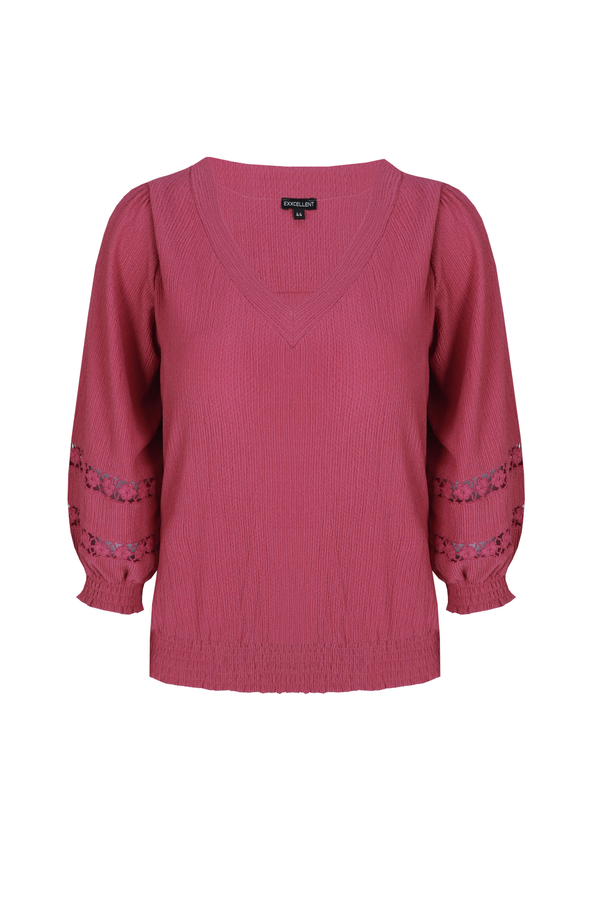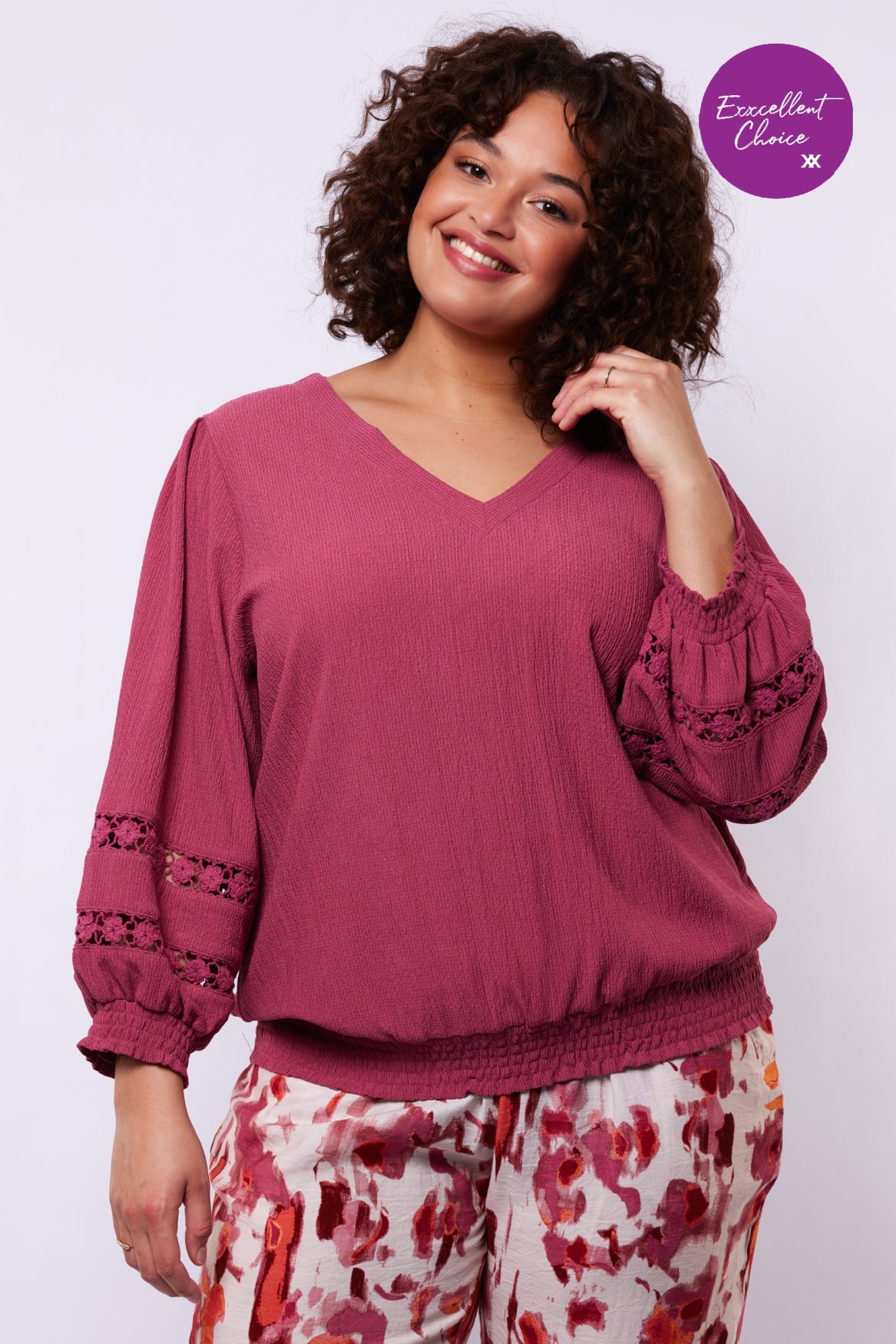 Een vrouwelijke essential met een zachte en elegante uitstraling. De Capry top heeft een losvallende pasvorm met een flatterende V-hals en een comfortabele, soepelvallende kwaliteit die prettig aanvoelt op de huid. De sierlijke kanten inzet op de mouwen en de subtiel gesmokte boord geven het ontwerp een verfijnde en romantische touch.