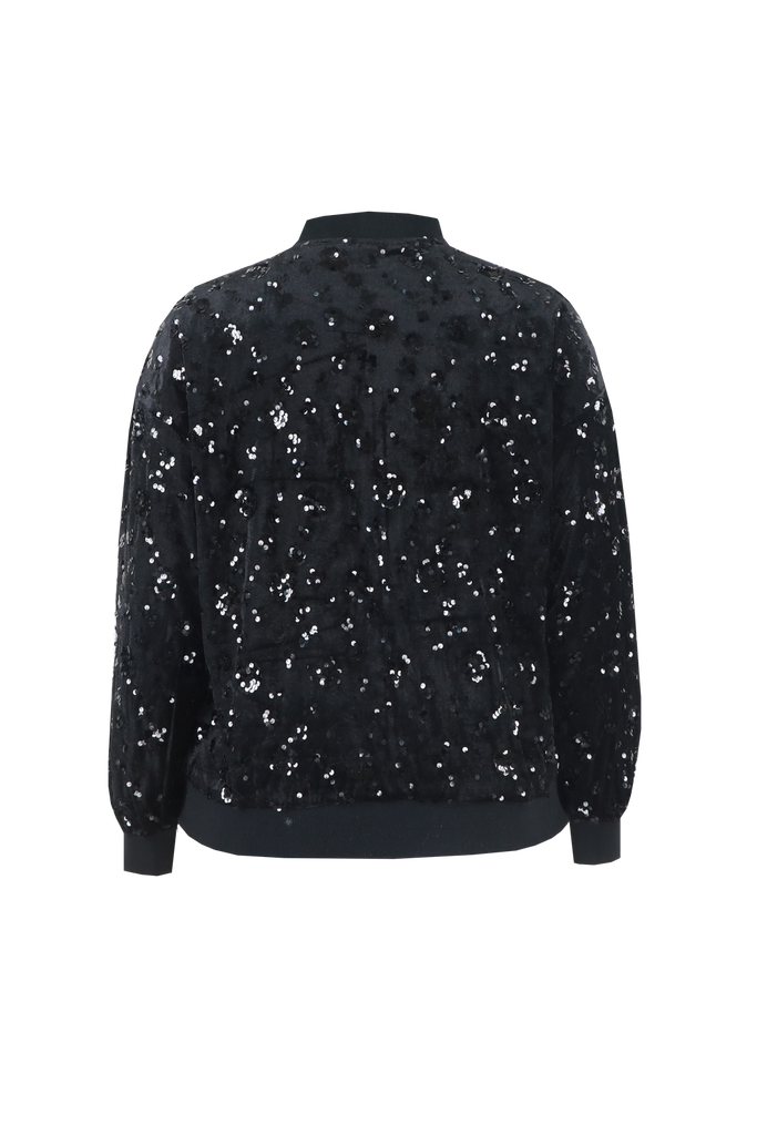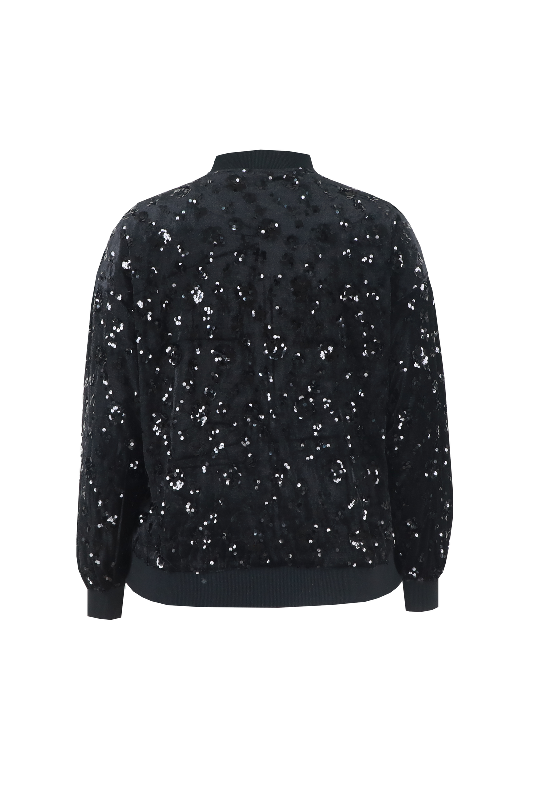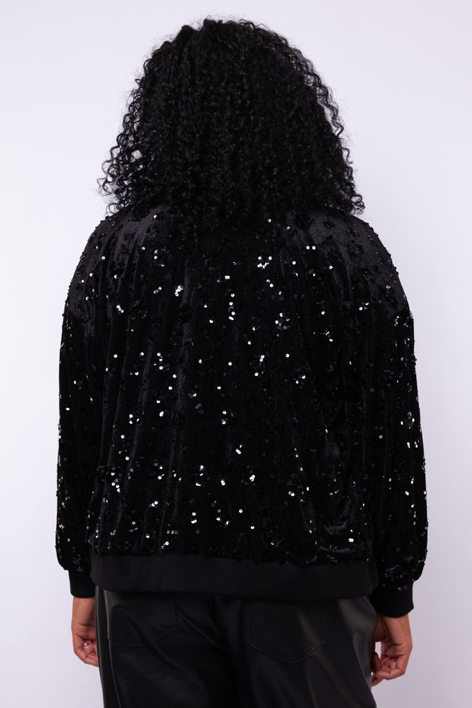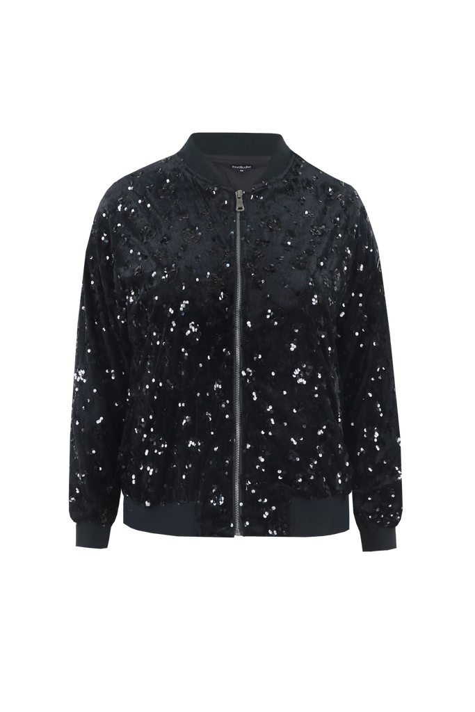 De Colette jacket is een echte blikvanger dankzij de rijke pailletten die over het hele oppervlak zijn verspreid. De jas heeft een sportieve uitstraling met een ritssluiting aan de voorzijde en een bomberstijl kraag, terwijl de glanzende afwerking een feestelijke touch toevoegt. De boorden aan de mouwen en onderzijde zorgen voor een comfortabele pasvorm. Ideaal voor een avondje uit of om een casual look een extra twist te geven.