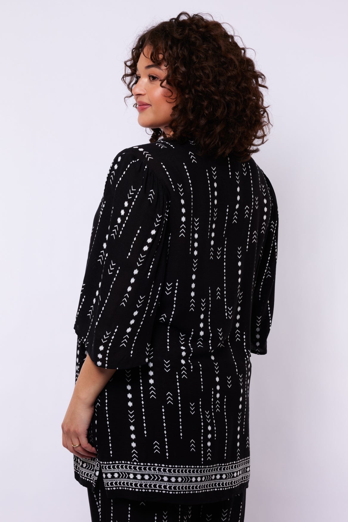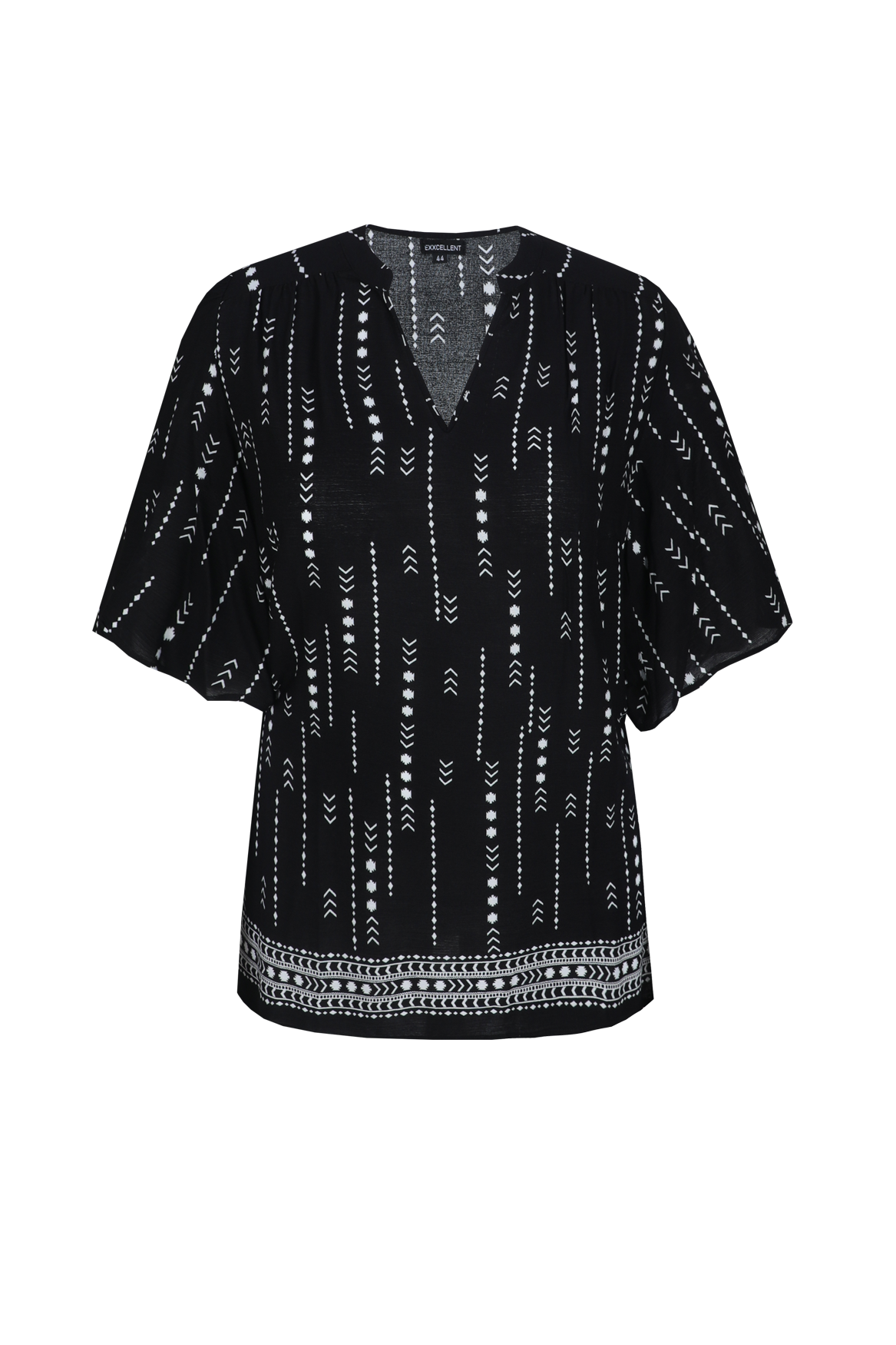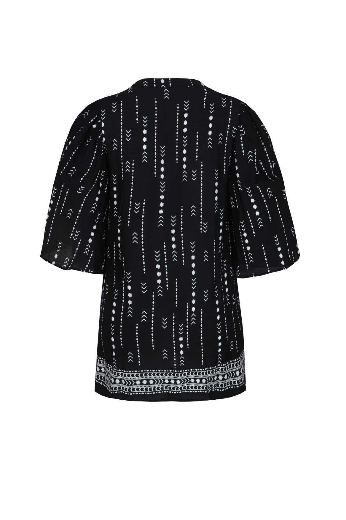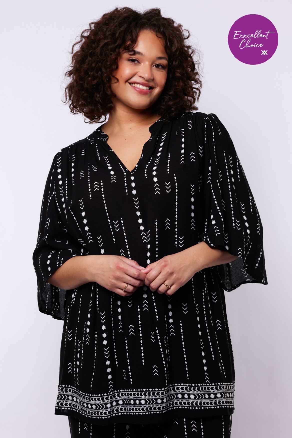 Een stijlvolle top met een moderne, grafische uitstraling. De Faye top heeft een soepelvallende pasvorm en een subtiele V-hals die het silhouet mooi laat uitkomen. De speelse print en de wijde mouwen geven het ontwerp een luchtige en elegante touch, terwijl de lengte zorgt voor een comfortabele fit.