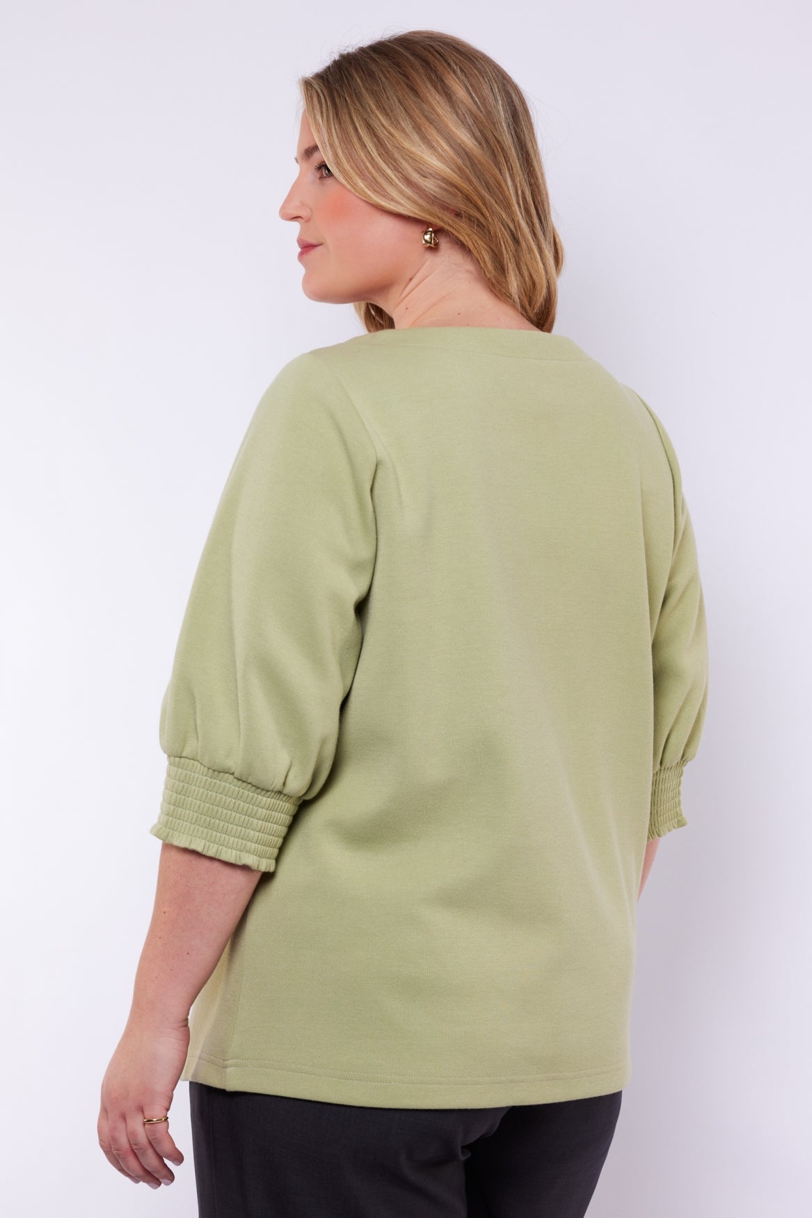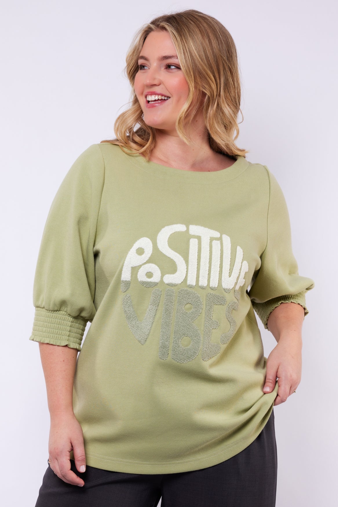 Breng wat positiviteit in je dag met een vleugje comfort. De Fenna sweater heeft een frisse uitstraling dankzij de zachte kleur en speelse “Positive Vibes” tekst. De korte pofmouwen met gesmokte boorden geven het item een vrouwelijke twist. Combineer met de Lauren broek voor een relaxte, stijlvolle look.