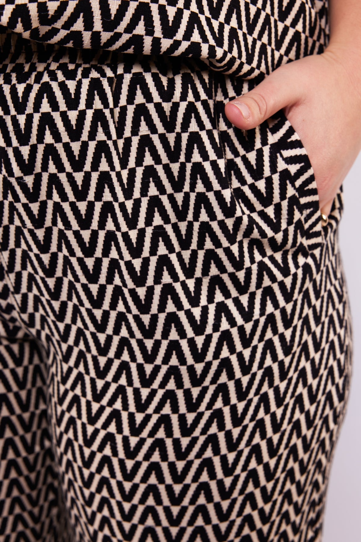 Een stijlvolle statement broek met een comfortabele en flatterende uitstraling. De Frankie broek heeft een rechte, wijdvallende pasvorm met een elastische tailleband die mooi aansluit en prettig draagt. De all-over print geeft de broek karakter en een moderne look, terwijl de soepele stof zorgt voor een elegant silhouet.