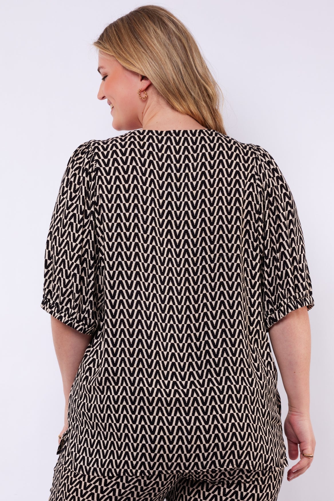 Een vrouwelijke eyecatcher met een moderne en elegante uitstraling. De Haisley top heeft een losvallende pasvorm met een flatterende V-hals en halflange mouwen met subtiele plooidetails bij de schouders en elastische manchetten. De all-over grafische print geeft het ontwerp een krachtige en stijlvolle touch, terwijl de soepelvallende kwaliteit zorgt voor een comfortabel draaggevoel.