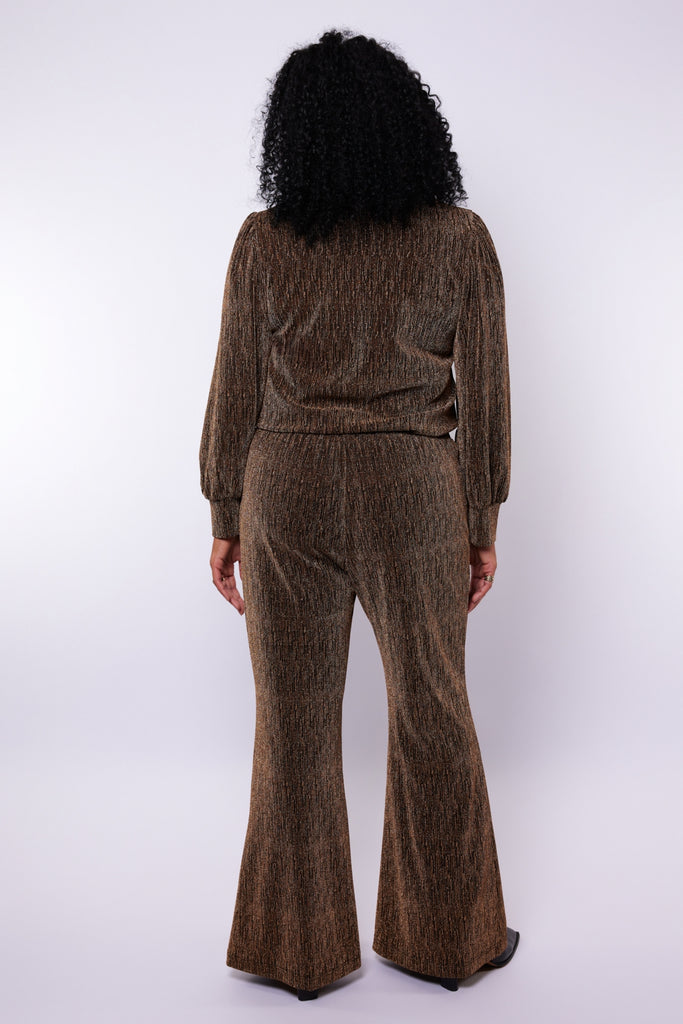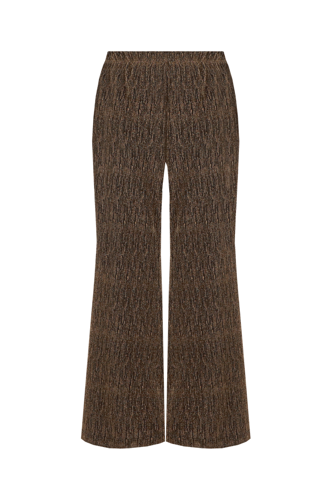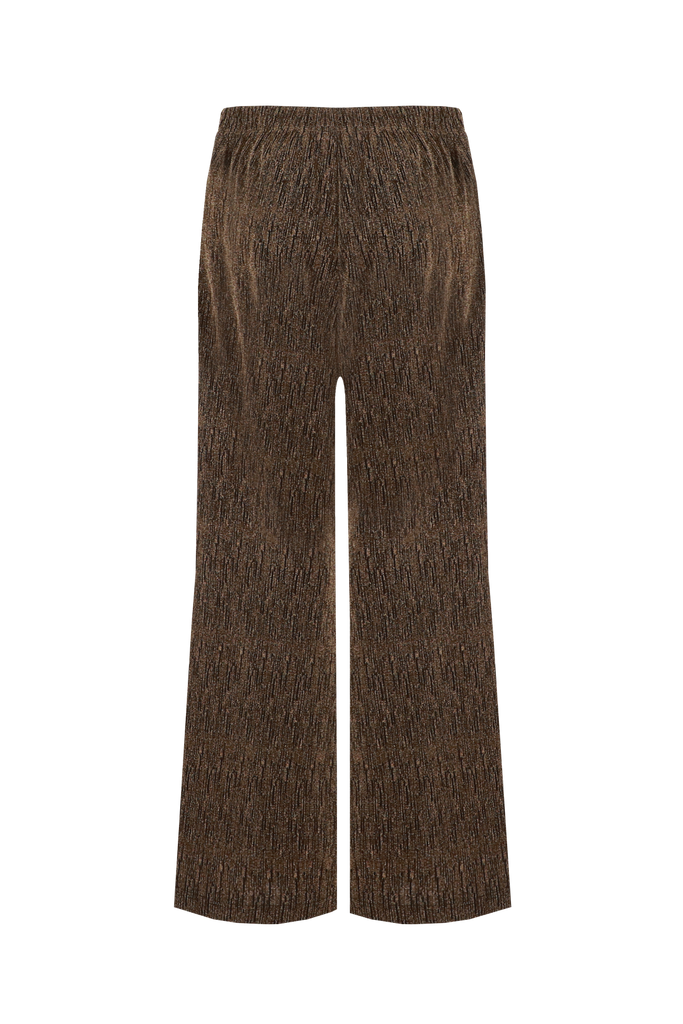 De Harmony broek is een stijlvolle keuze met een comfortabele pasvorm. Deze broek is voorzien van een elastische tailleband, wat zorgt voor extra draagcomfort en een mooie pasvorm. Het rechte model met wijduitlopende pijpen geeft een elegante uitstraling, perfect voor zowel casual als geklede gelegenheden. Gemaakt van een soepelvallende stof met subtiele glans voor een modieuze touch. Combineer met de bijpassende Bes top voor een complete en trendy look.