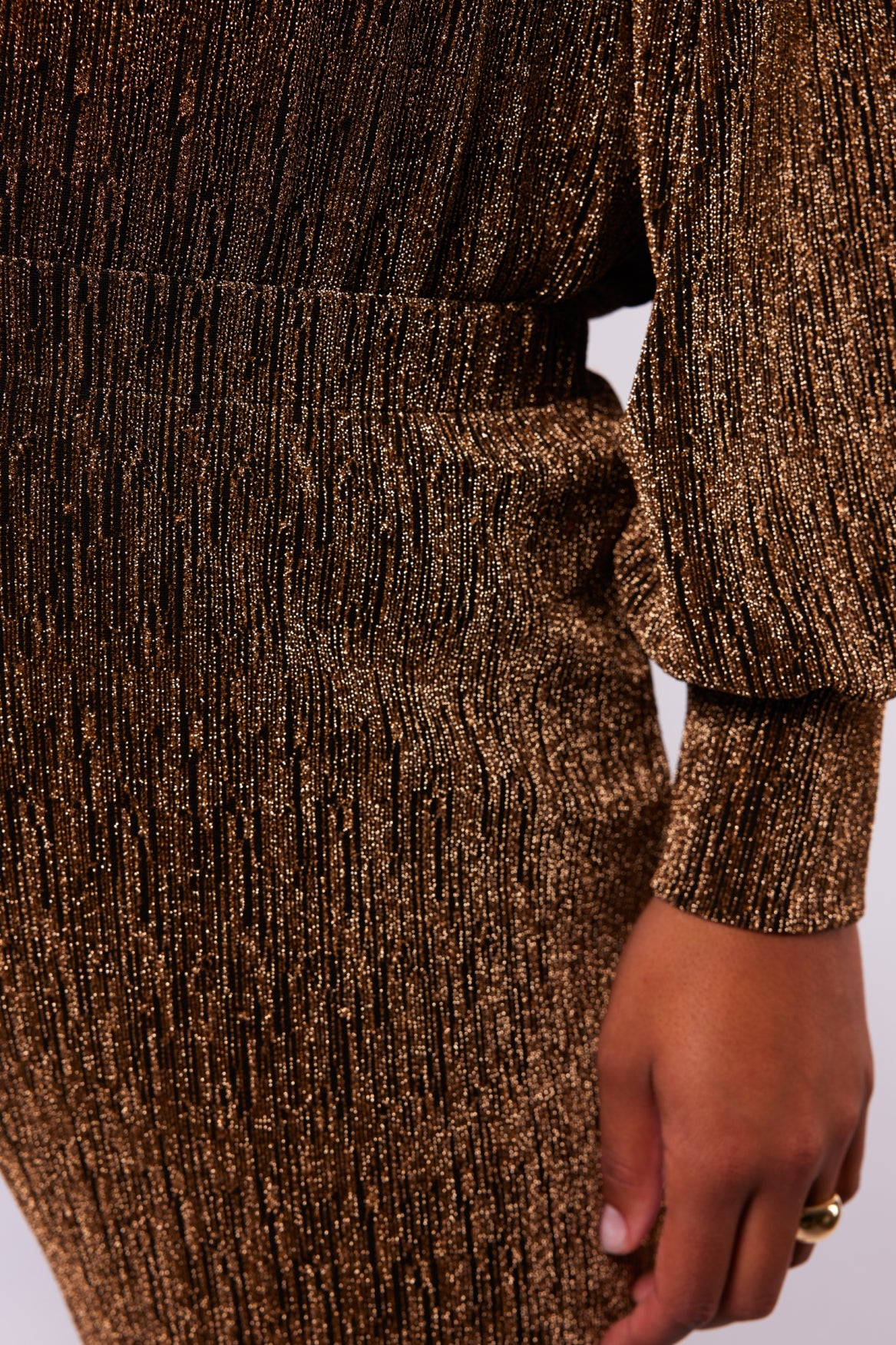 Het model is 179 cm lang en draagt een maat 46.