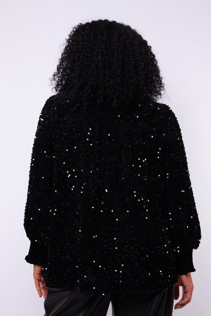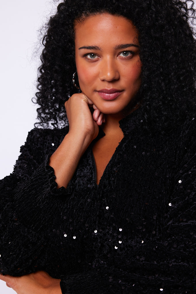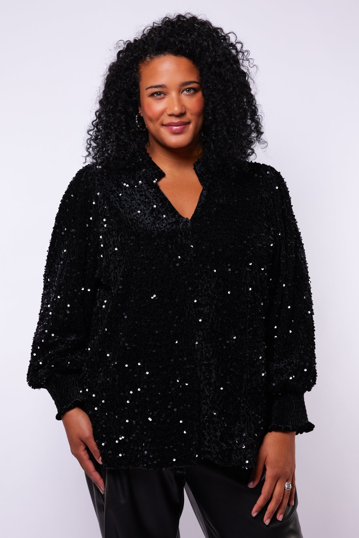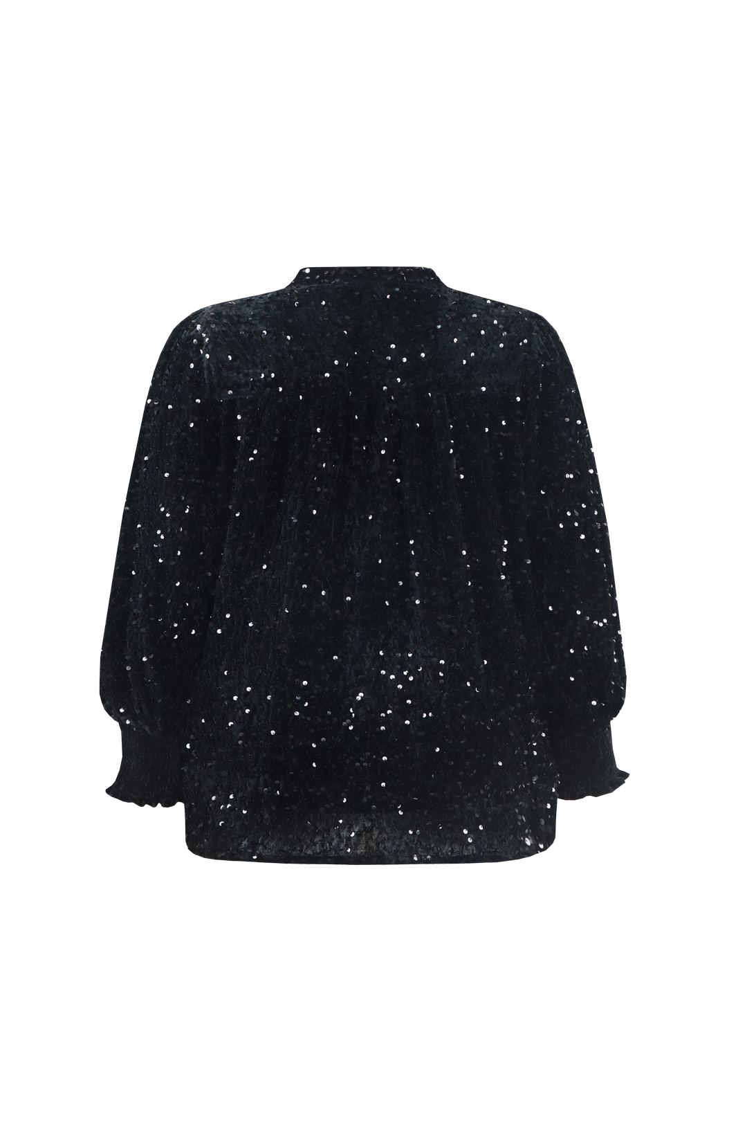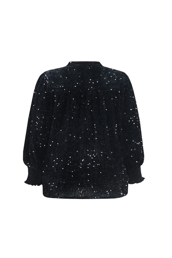 De Isolde top is gemaakt om op te vallen. De glinsterende pailletten en de elegante keyhole-halslijn geven dit item een feestelijke uitstraling met een vleugje luxe. Dankzij de soepele pasvorm en de elastische manchetten draag je deze top zowel comfortabel als stijlvol – perfect voor een avond uit of een speciale gelegenheid.