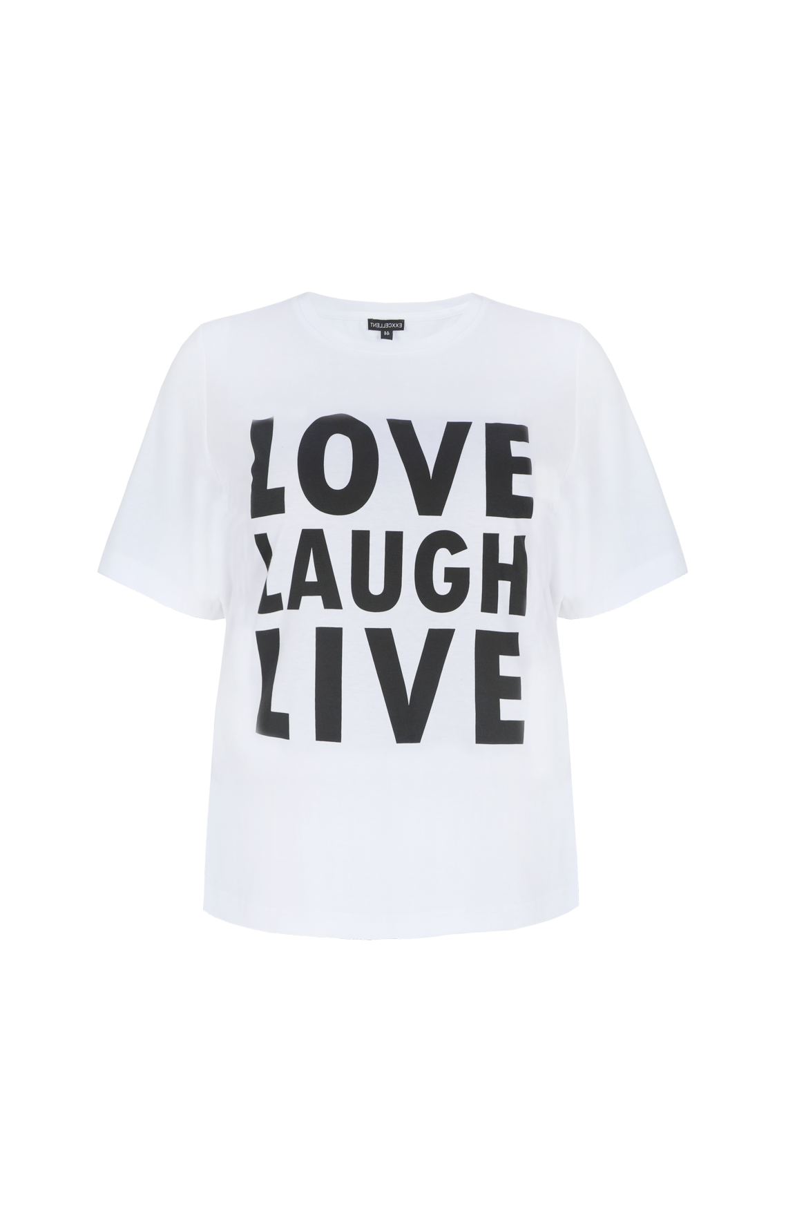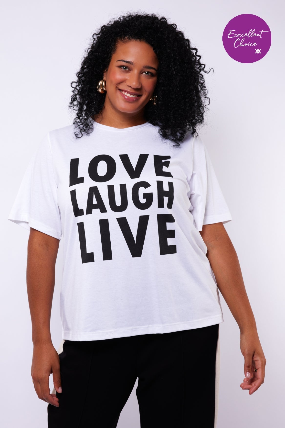 Stoer en stijlvol in één. Het Jinte T-shirt valt op door de krachtige “LOVE LAUGH LIVE”-print die positiviteit uitstraalt. De comfortabele jersey kwaliteit met stretch zorgt voor een fijne pasvorm en een zachte feel. Een echte everyday favorite die moeiteloos combineert met denim, een blazer of een casual broek.