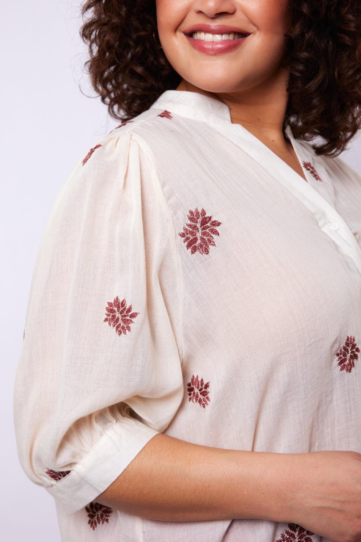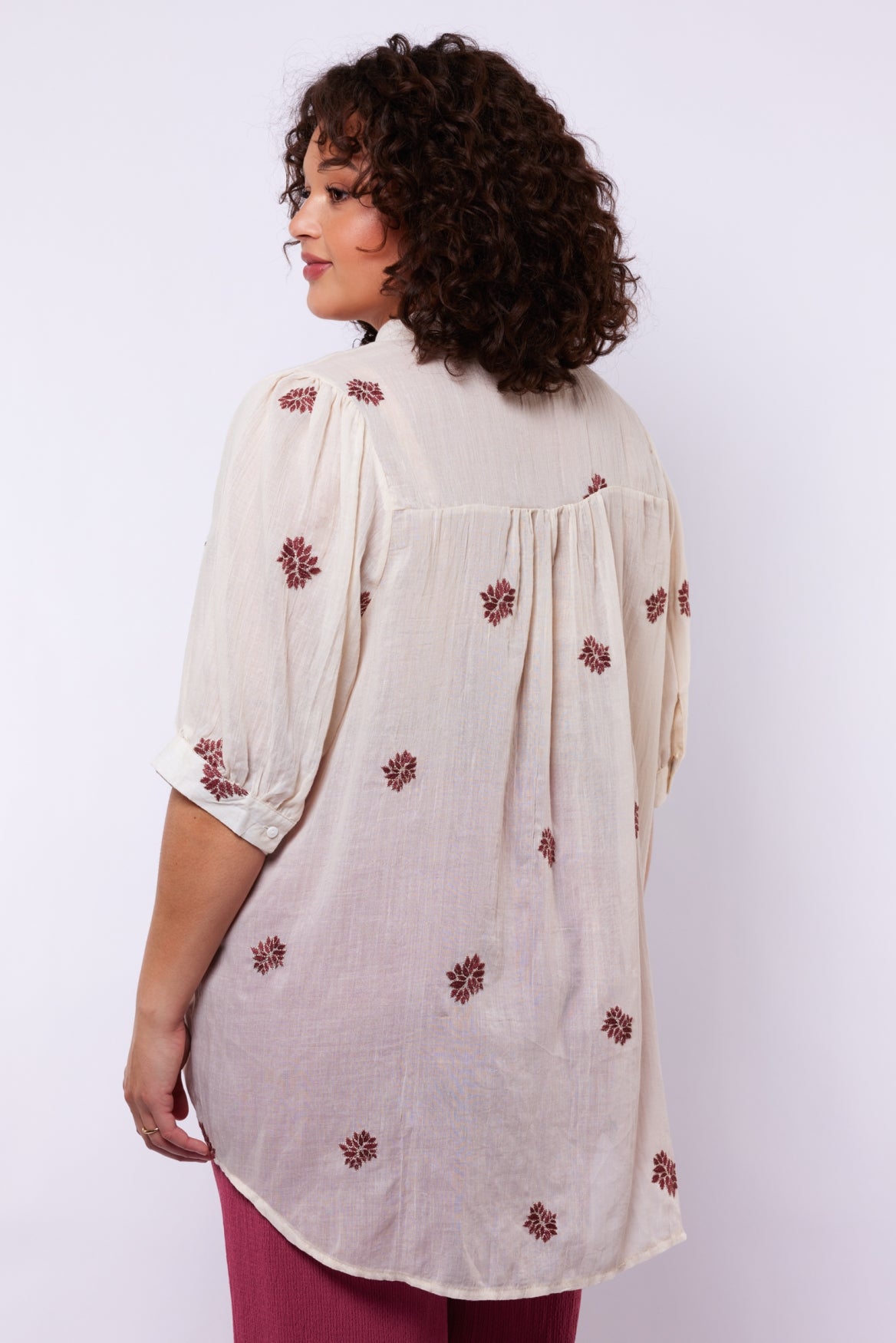 Een luchtige blouse met een zachte, vrouwelijke uitstraling. De Khloe blouse heeft een soepelvallende pasvorm, een subtiele opstaande hals en een doorknoopsluiting die zorgen voor een elegante basis. Het verfijnde borduurwerk geeft het ontwerp een speels en ambachtelijk karakter, terwijl de lichte stof comfortabel met je meebeweegt.