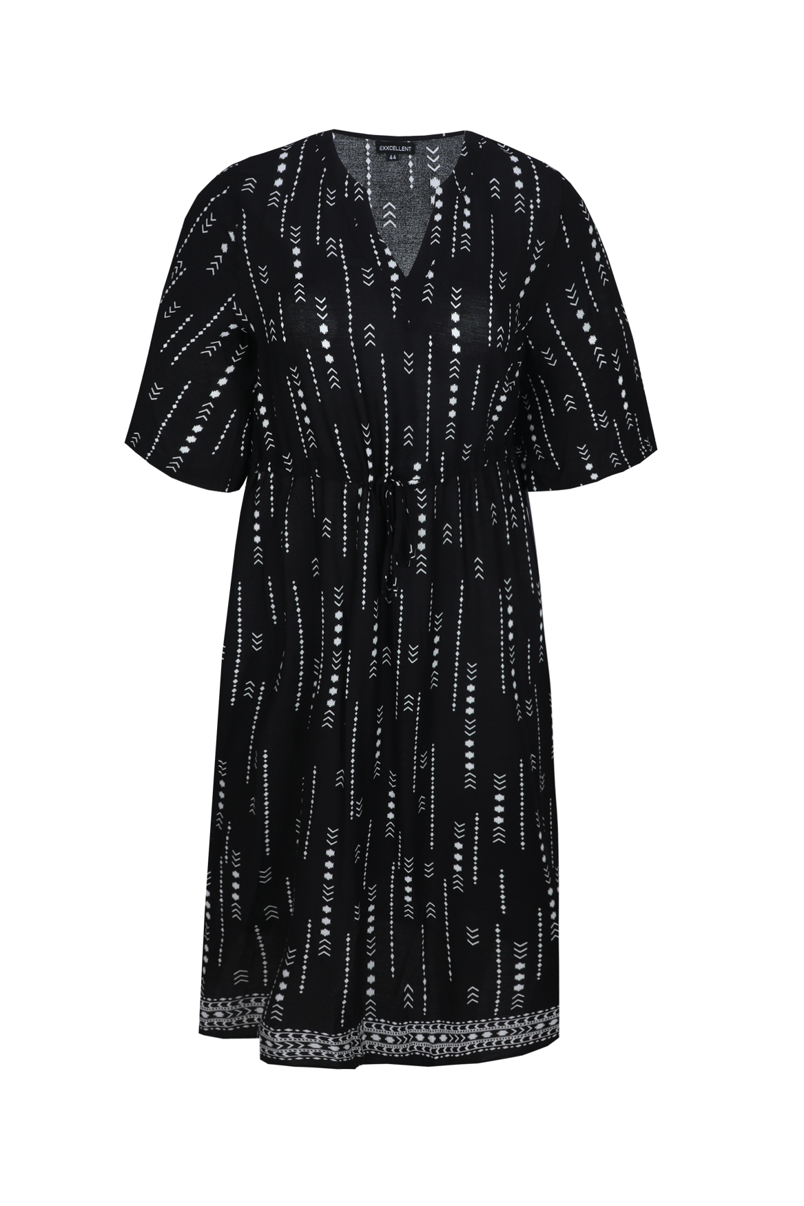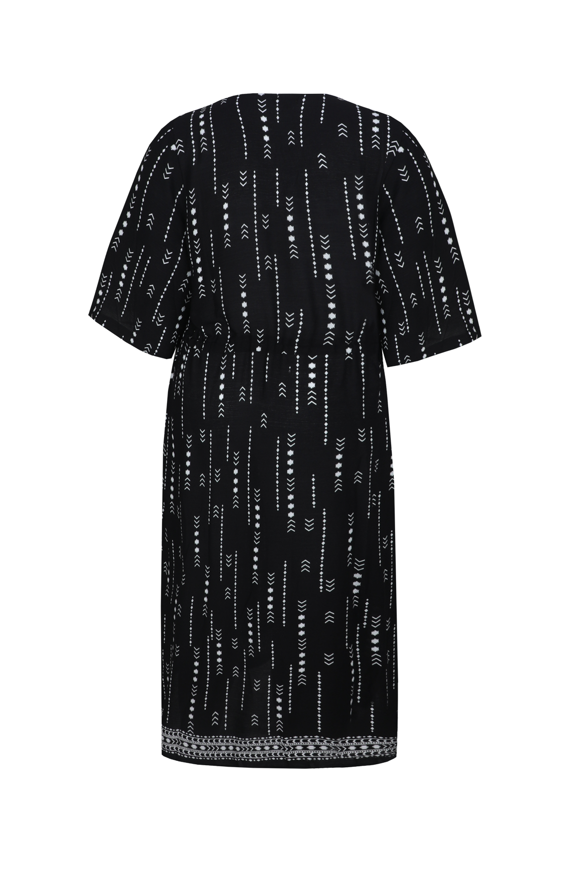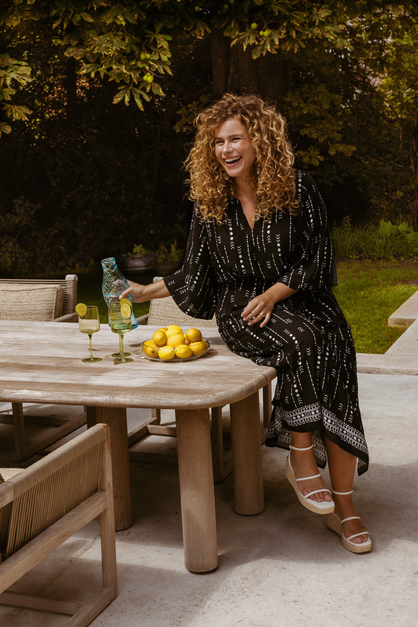 Een elegante maxi jurk met een moderne, grafische uitstraling. De Saylor jurk heeft een soepelvallende pasvorm en een subtiele V-hals die zorgt voor een vrouwelijke lijn. De wijde mouwen en de taille met strikceintuur geven het silhouet extra vorm, terwijl de contrasterende print en de decoratieve boord onderaan het ontwerp karakter geven. Comfort en stijl komen hier moeiteloos samen.