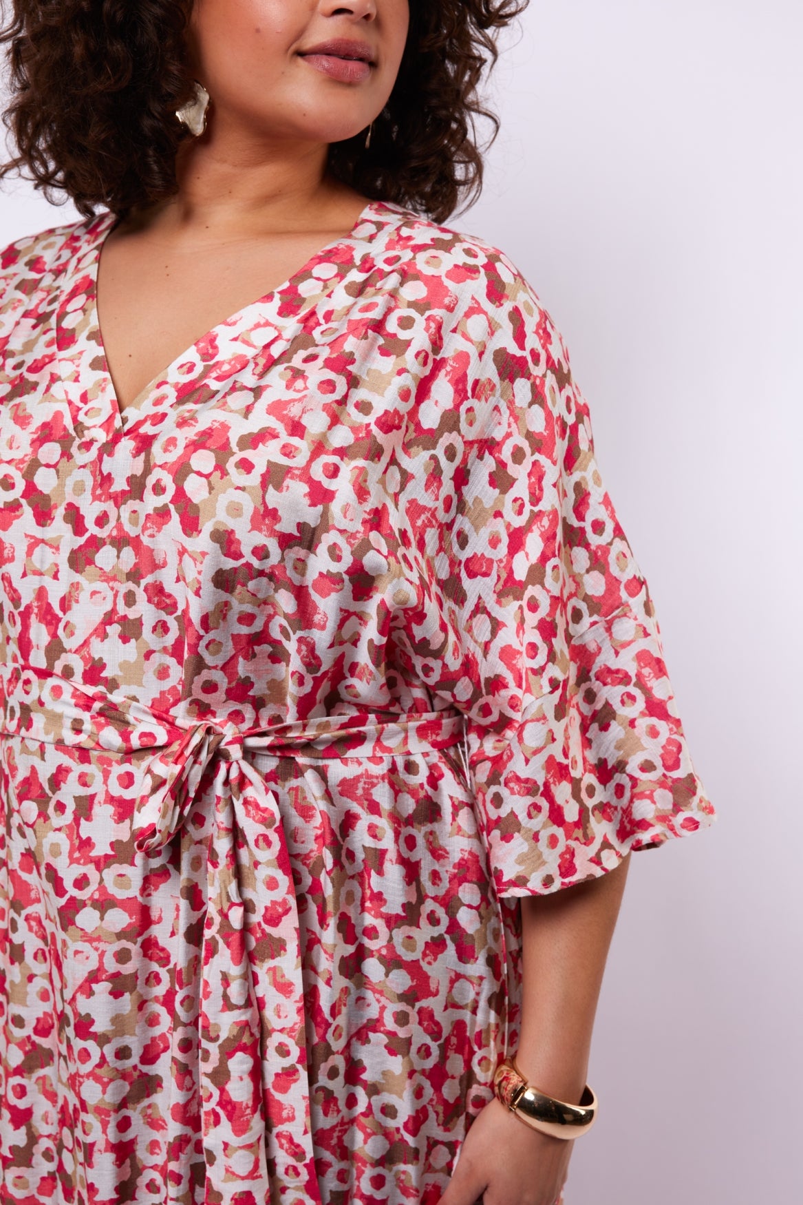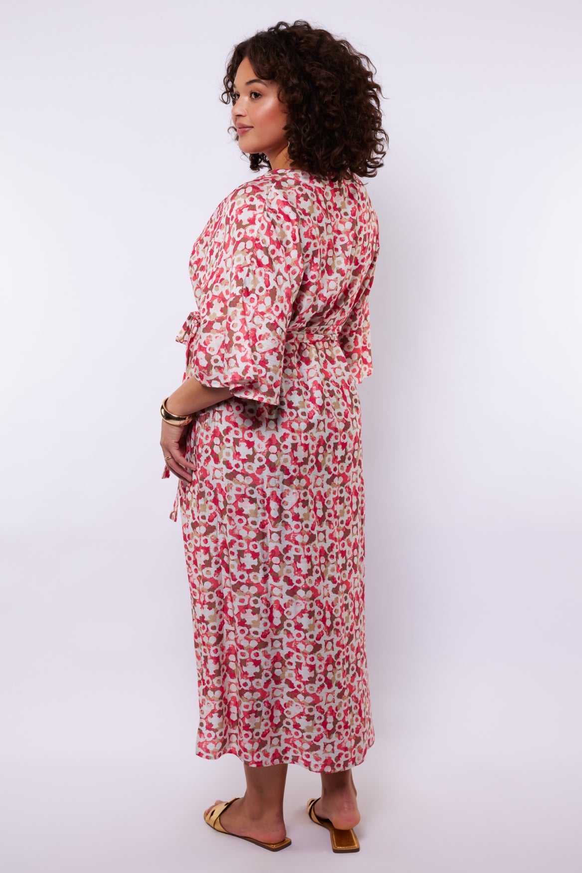 Een vrouwelijke jurk met een speelse print en een elegante, luchtige fit. De Seren jurk valt soepel langs het lichaam en wordt mooi geaccentueerd door de strikceintuur in de taille. De V-hals en wijde mouwen geven het item een zachte, stijlvolle uitstraling, terwijl de lengte zorgt voor een effortless en comfortabele look. Perfect voor zowel een dagje uit als een ontspannen moment in de zon.