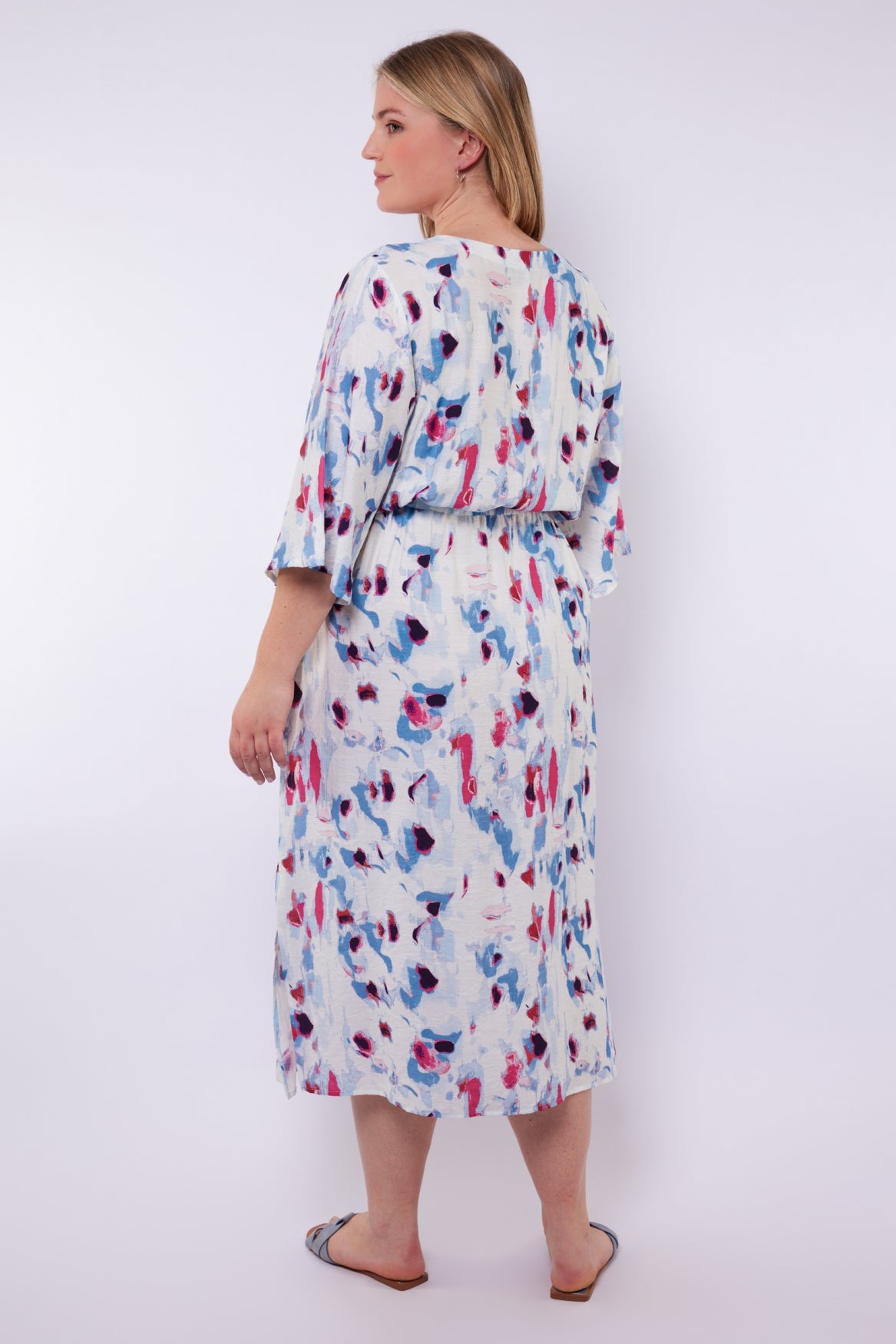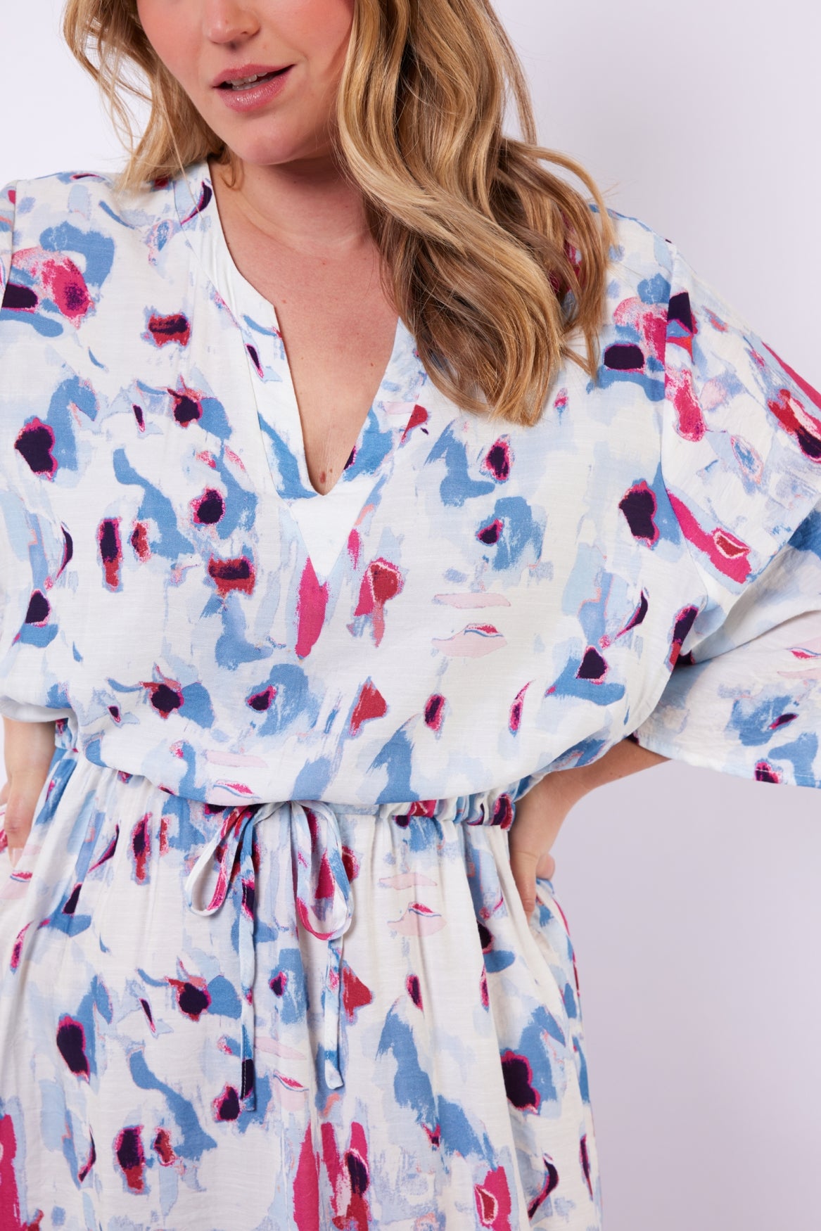 Een vrouwelijke midi jurk met een expressieve all-over print. De Soraya jurk heeft een losvallende pasvorm met een flatterende V-hals en wijde mouwen die zorgen voor een luchtige uitstraling. De elastische taille met strikceintuur accentueert subtiel het silhouet en biedt extra draagcomfort. Het model valt soepel langs het lichaam en is voorzien van een elegante zijsplit voor extra bewegingsvrijheid.
