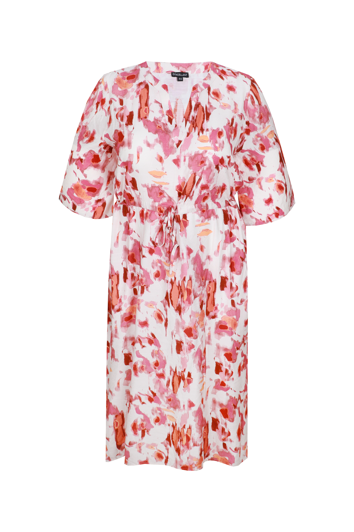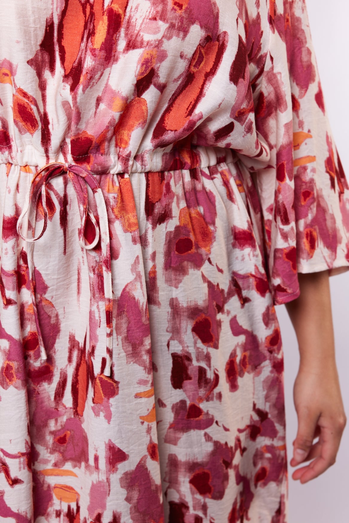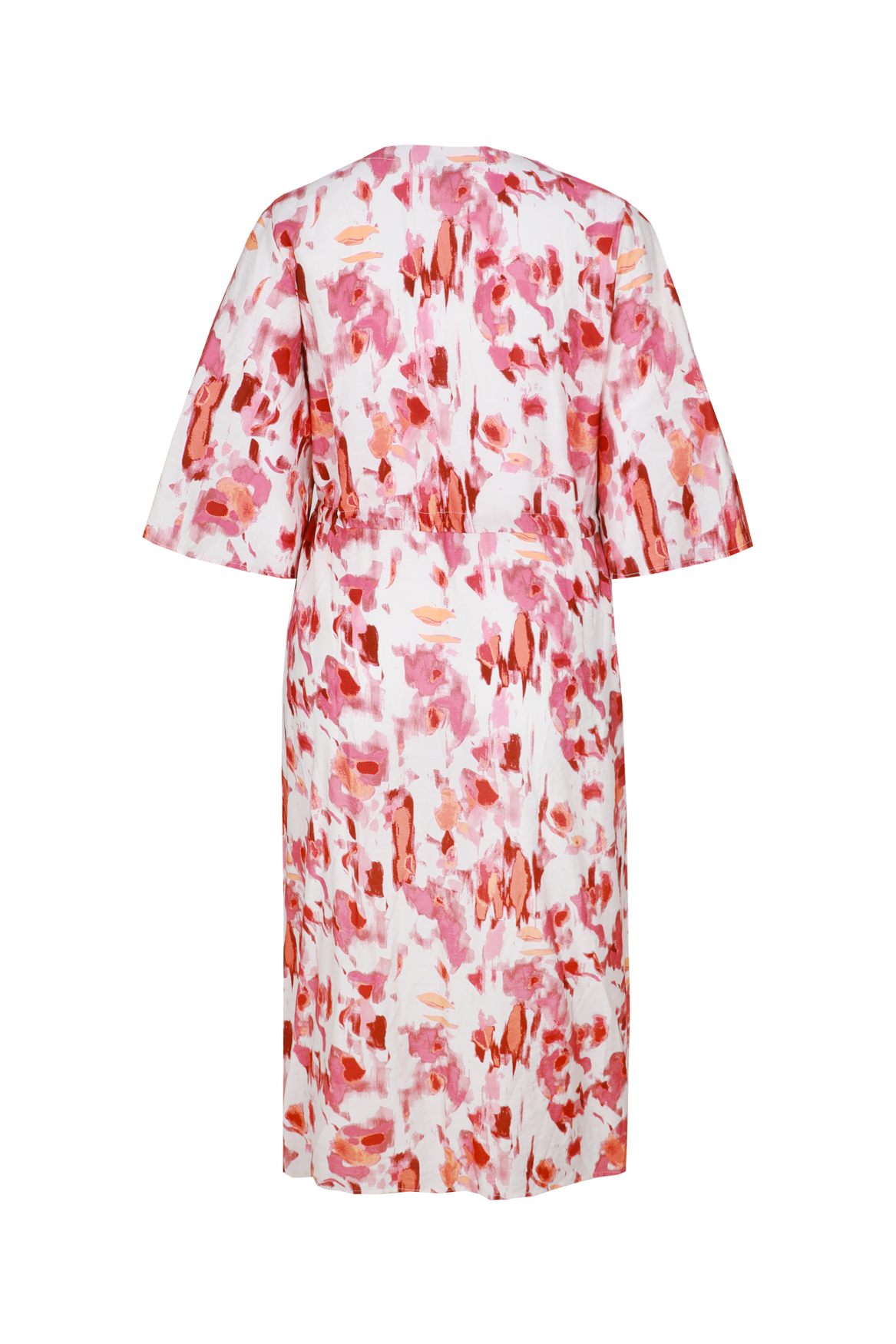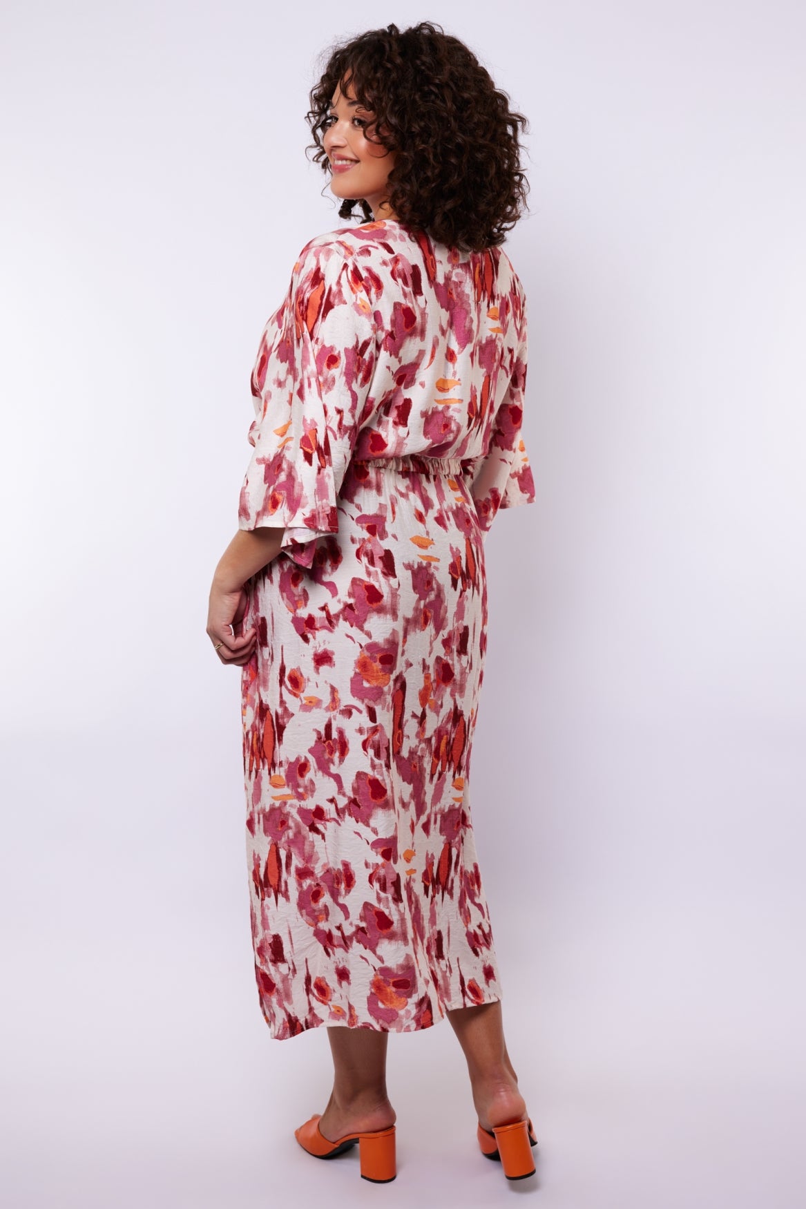 Een vrouwelijke midi jurk met een expressieve all-over print. De Soraya jurk heeft een losvallende pasvorm met een flatterende V-hals en wijde mouwen die zorgen voor een luchtige uitstraling. De elastische taille met strikceintuur accentueert subtiel het silhouet en biedt extra draagcomfort. Het model valt soepel langs het lichaam en is voorzien van een elegante zijsplit voor extra bewegingsvrijheid.