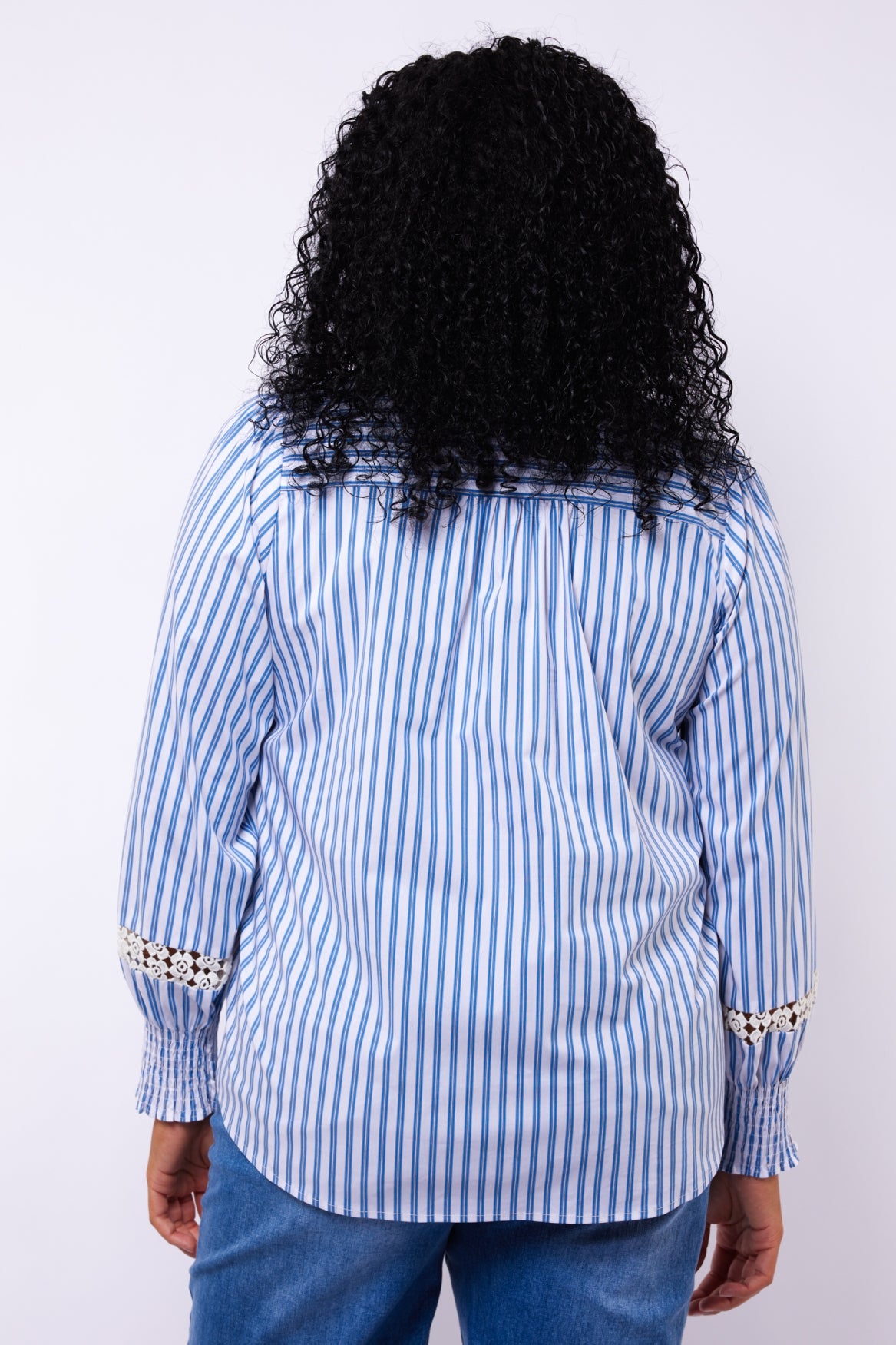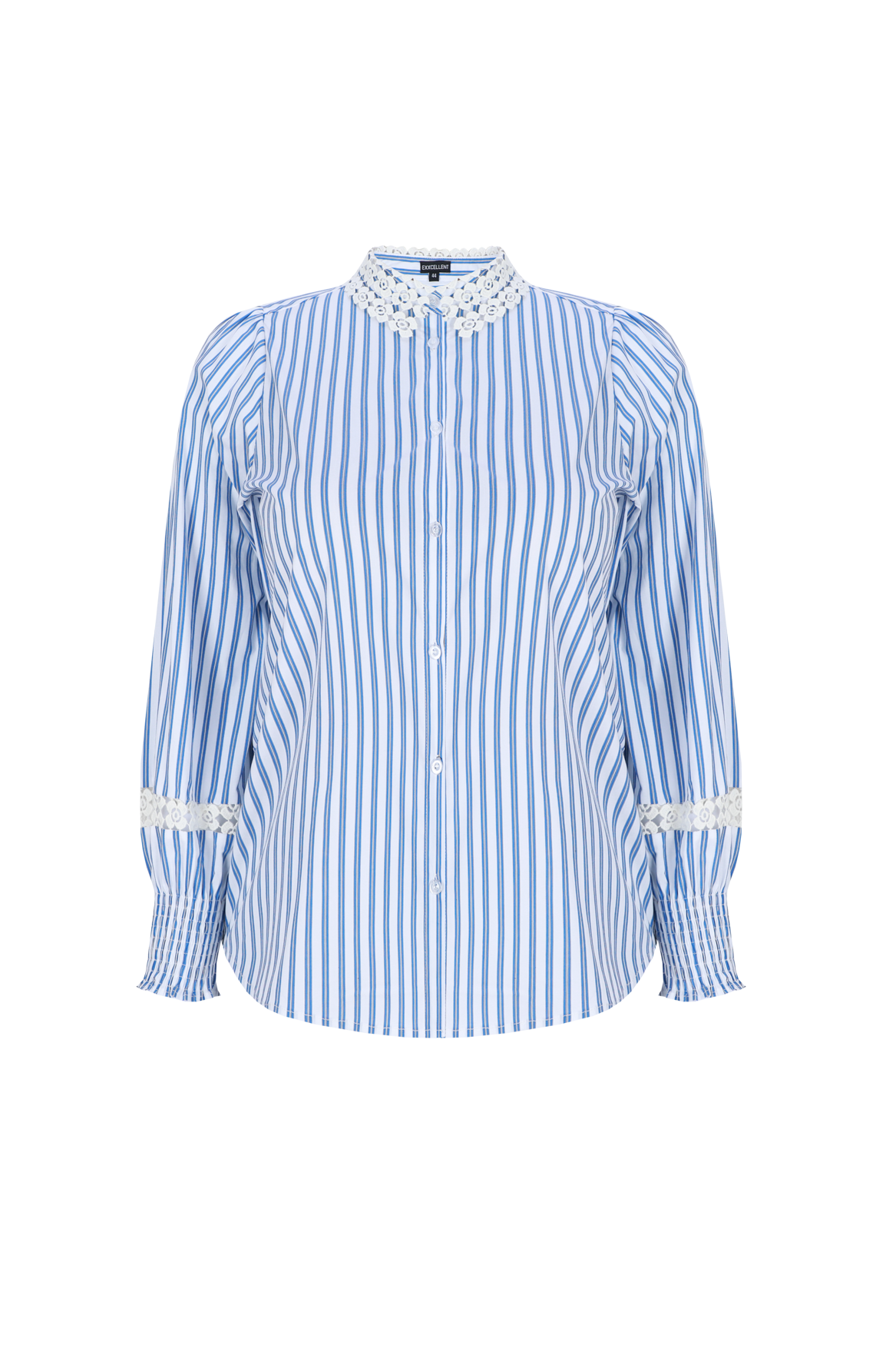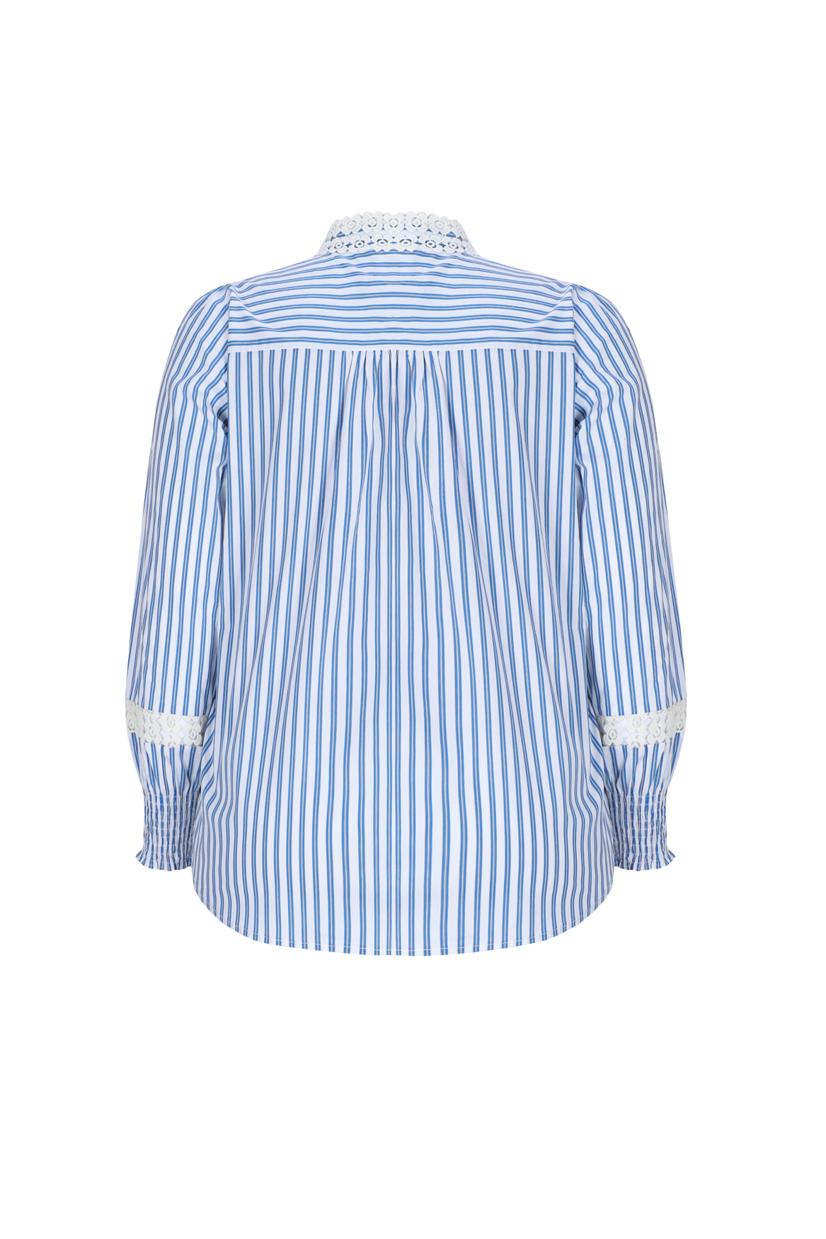 Een klassieke blouse met een romantisch accent. De Verena blouse is voorzien van een subtiel streepdessin en verfijnde kanten details langs de kraag en mouwen. De geplooide schouders en smockboorden geven het ontwerp een vrouwelijke, eigentijdse uitstraling.